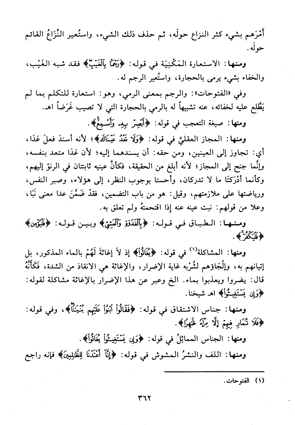 ومنها: المجاز العقليَّ في قوله: {وَلا تَعْدُ عَيْناكَ}؛ لأنه أسند فعل عدا، أي: تجاوز إلى العينين، ومن حقه: أن يسندهما إليه؛ لأن عدا متعد بنفسه، وإنّما جنح إلى المجاز؛ لأنه أبلغ من الحقيقة، فكأنّ عينيه ثابتتان في الرنوّ إليهم، وكأنما أدركتا ما لا تدركان، وأحستا بوجوب النظر، إلى هؤلاء، وصبر النفس، ورياضتها على ملازمتهم، وقيل: هو من باب التضمين، فقد ضمّن عدا معنى نبا، وعلا من قولهم: نبت عينه عنه إذا اقتحمته ولم تعلق به.