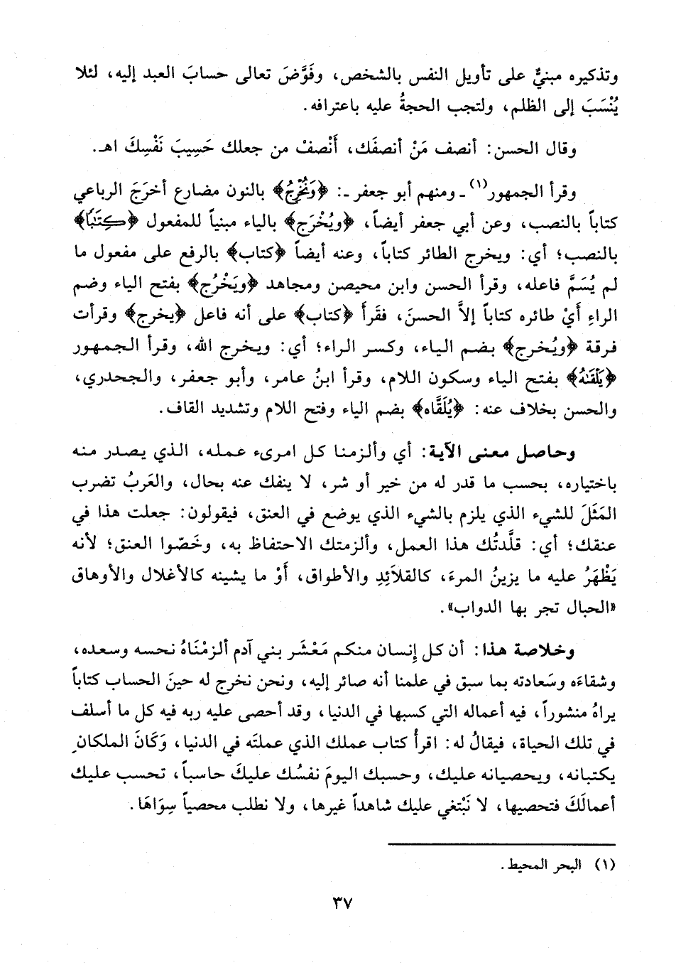 وخلاصة هذا: أن كل إنسان منكم معشر بني آدم ألزمناه نحسه وسعده، وشقاءه وسعادته بما سبق في علمنا أنه صائر إليه، ونحن نخرج له حين الحساب كتابا يراه منشورا، فيه أعماله التي كسبها في الدنيا، وقد أحصى عليه ربه فيه كل ما أسلف في تلك الحياة، فيقال له: اقرأ كتاب عملك الذي عملته في الدنيا، وكان الملكان يكتبانه، ويحصيانه عليك، وحسبك اليوم نفسك عليك حاسبا، تحسب عليك أعمالك فتحصيها، لا نبتغي عليك شاهدًا غيرها، ولا نطلب محصيًا سواها.