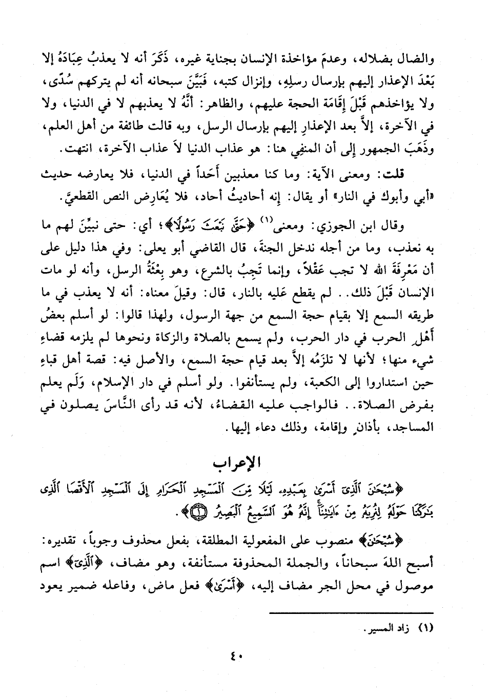 وقال ابن الجوزي: ومعنى (¬1) {حَتَّى نَبْعَثَ رَسُولًا}؛ أي: حتى نبيّن لهم ما به نعذب، وما من أجله ندخل الجنة، قال القاضي أبو يعلى: وفي هذا دليل على أن معرفة الله لا تجب عقلًا، وإنما تجب بالشرع، وهو بعثة الرسل، وأنه لو مات الإنسان قبل ذلك .. لم يقطع عليه بالنار، قال: وقيل معناه: أنه لا يعذب في ما طريقه السمع إلا بقيام حجة السمع من جهة الرسول، ولهذا قالوا: لو أسلم بعض أهل الحرب في دار الحرب، ولم يسمع بالصلاة والزكاة ونحوها لم يلزمه قضاء شيء منها؛ لأنها لا تلزمه إلّا بعد قيام حجة السمع، والأصل فيه: قصة أهل قباء حين استداروا إلى الكعبة، ولم يستأنفوا. ولو أسلم في دار الإسلام، ولم يعلم بفرض الصلاة .. فالواجب عليه القضاء، لأنه قد رأى النّاس يصلون في المساجد، بأذانٍ وإقامة، وذلك دعاء إليها.