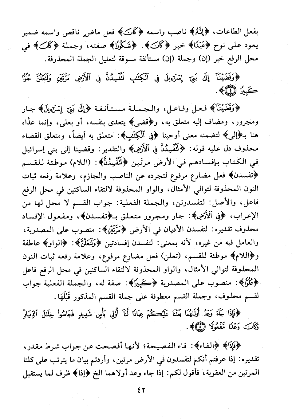 {وَقَضَيْنا} فعل وفاعل، والجملة مستأنفة {إِلى بَنِي إِسْرائِيلَ} جار ومجرور، ومضاف إليه متعلق به، و {قضى} يتعدى بنفسه، أو بعلى، وإنما عدّاه هنا بـ {إِلى} لتضمنه معنى أوحينا {فِي الْكِتابِ}: متعلق به أيضًا، ومتعلق القضاء محذوف دل عليه قوله: {لَتُفْسِدُنَّ فِي الْأَرْضِ} والتقدير: وقضينا إلى بني إسرائيل في الكتاب بإفسادهم في الأرض مرتين {لَتُفْسِدُنَّ}: {اللام} موطئة للقسم {تفسدن} فعل مضارع مرفوع لتجرده عن الناصب والجازم، وعلامة رفعه ثبات النون المحذوفة لتوالي الأمثال، والواو المحذوفة لالتقاء الساكنين في محل الرفع فاعل، والأصل: لتفسدونن، والجملة الفعلية: جواب القسم لا محل لها من الإعراب، {فِي الْأَرْضِ}: جار ومجرور متعلق بـ {تفسدن}، ومفعول الإفساد محذوف تقديره: لتفسدن الأديان في الأرض {مَرَّتَيْنِ}: منصوب على المصدرية، والعامل فيه من غيره، لأنه بمعنى: لتفسدن إفسادتين {وَلَتَعْلُنَّ}: {الواو} عاطفة و {اللام} موطئة للقسم، (تعلن) فعل مضارع مرفوع، وعلامة رفعه ثبات النون المحذوفة لتوالي الأمثال، والواو المحذوفة لالتقاء الساكنين في محل الرفع فاعل {عُلُوًّا}: منصوب على المصدرية {كَبِيرًا}: صفة له، والجملة الفعلية جواب لقسم محذوف، وجملة القسم معطوفة على جملة القسم المذكور قبلها.