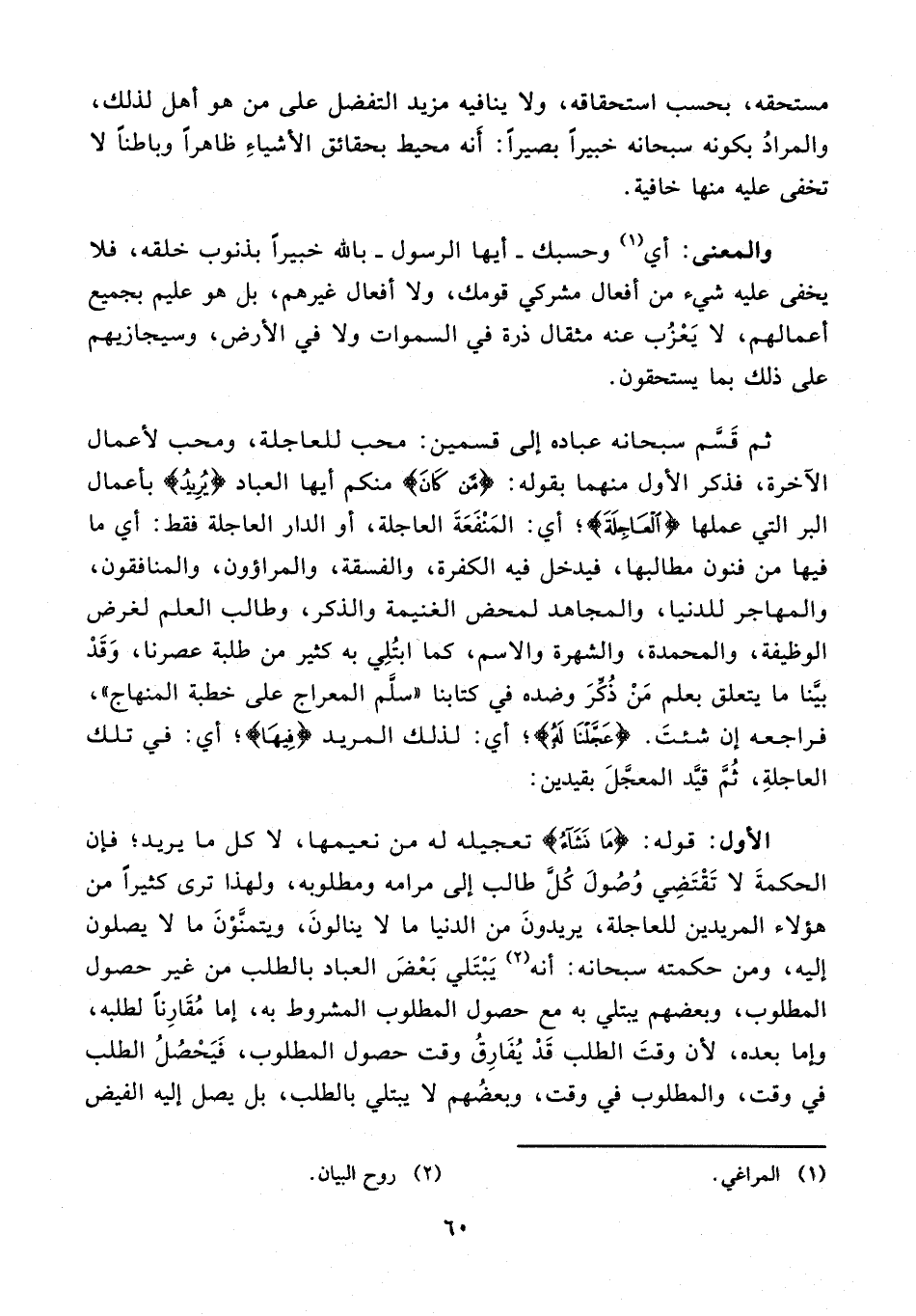 18 - ثم قسّم سبحانه عباده إلى قسمين: محب للعاجلة، ومحب لأعمال الآخرة، فذكر الأول منهما بقوله: {مَنْ كانَ} منكم أيها العباد {يُرِيدُ} بأعمال البر التي عملها {الْعاجِلَةَ}؛ أي: المنفعة العاجلة، أو الدار العاجلة فقط: أي ما فيها من فنون مطالبها، فيدخل فيه الكفرة، والفسقة، والمراؤون، والمنافقون، والمهاجر للدنيا، والمجاهد لمحض الغنيمة والذكر، وطالب العلم لغرض الوظيفة، والمحمدة، والشهرة والاسم، كما ابتلي به كثير من طلبة عصرنا، وقد بيّنا ما يتعلق بعلم من ذكّر وضده في كتابنا «سلّم المعراج على خطبة المنهاج»، فراجعه إن شئت. {عَجَّلْنا لَهُ}؛ أي: لذلك المريد {فِيها}؛ أي: في تلك العاجلة، ثمّ قيّد المعجّل بقيدين: