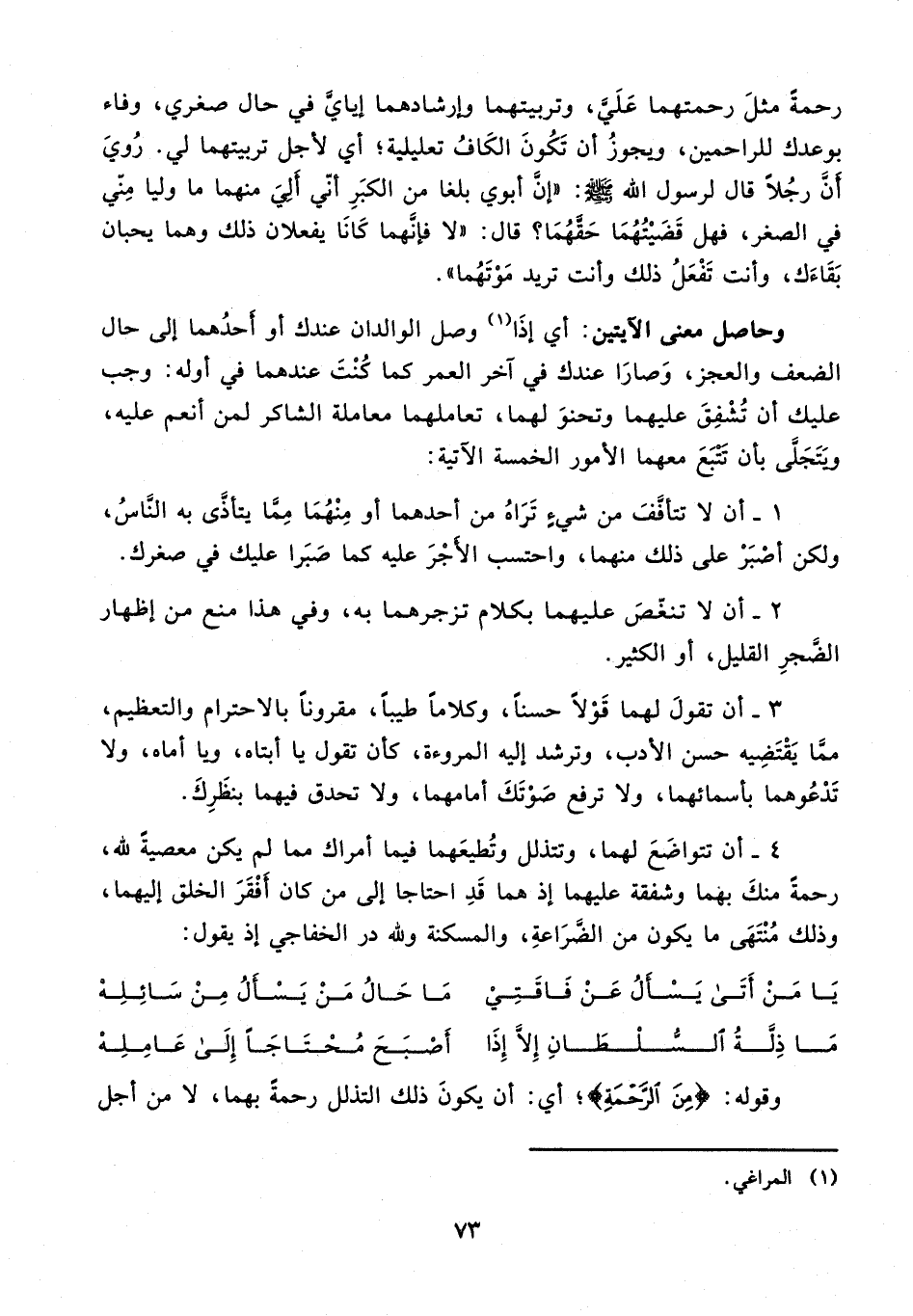 وحاصل معنى الآيتين: أي إذا (¬1) وصل الوالدان عندك أو أحدهما إلى حال الضعف والعجز، وصَارَا عندك في آخر العمر كما كنت عندهما في أوله: وجب عليك أن تشفق عليهما وتحنو لهما، تعاملهما معاملة الشاكر لمن أنعم عليه، ويتجلّى بأن تتبع معهما الأمور الخمسة الآتية: