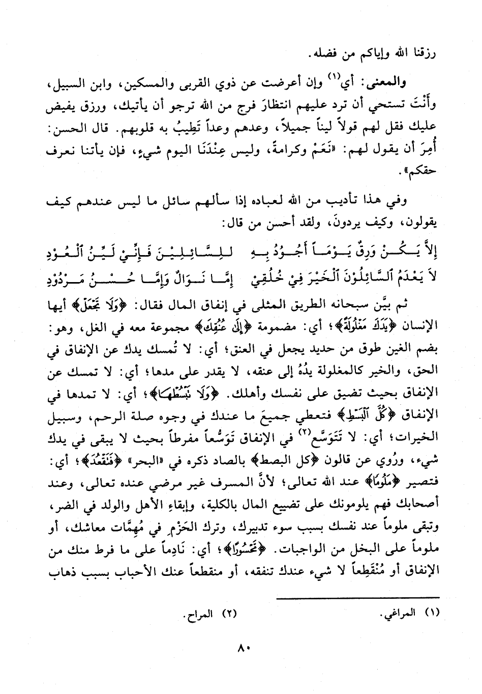 29 - ثم بيّن سبحانه الطريق المثلى في إنفاق المال فقال: {وَلا تَجْعَلْ} أيها الإنسان {يَدَكَ مَغْلُولَةً}؛ أي: مضمومة {إِلى عُنُقِكَ} مجموعة معه في الغل، وهو: بضم الغين طوق من حديد يجعل في العنق؛ أي: لا تمسك يدك عن الإنفاق في الحق، والخير كالمغلولة يده إلى عنقه، لا يقدر على مدها؛ أي: لا تمسك عن الإنفاق بحيث تضيق على نفسك وأهلك. {وَلا تَبْسُطْها}؛ أي: لا تمدها في الإنفاق {كُلَّ الْبَسْطِ} فتعطي جميع ما عندك في وجوه صلة الرحم، وسبيل الخيرات؛ أي: لا تتوسّع (¬2) في الإنفاق توسّعًا مفرطًا بحيث لا يبقى في يدك شيء، وروي عن قالون {كل البصط} بالصاد ذكره في «البحر» {فَتَقْعُدَ}؛ أي: فتصير {مَلُومًا} عند الله تعالى؛ لأنّ المسرف غير مرضي عنده تعالى، وعند أصحابك فهم يلومونك على تضييع المال بالكلية، وإبقاء الأهل والولد في الضر، وتبقى ملوما عند نفسك بسبب سوء تدبيرك، وترك الحزم في مهمّات معاشك، أو ملومًا على البخل من الواجبات. {مَحْسُورًا}؛ أي: نادمًا على ما فرط منك من الإنفاق أو منقطعًا لا شيء عندك تنفقه، أو منقطعًا عنك الأحباب بسبب ذهاب