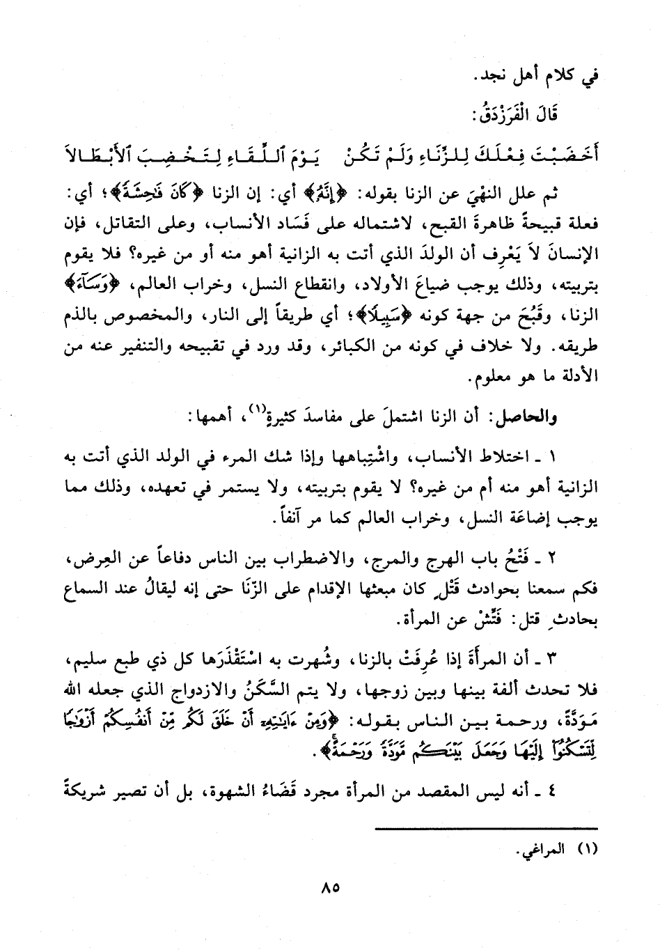 1 - اختلاط الأنساب، واشتباهها وإذا شك المرء في الولد الذي أتت به الزانية أهو منه أم من غيره؟ لا يقوم بتربيته، ولا يستمر في تعهده، وذلك مما يوجب إضاعة النسل، وخراب العالم كما مر آنفًا.