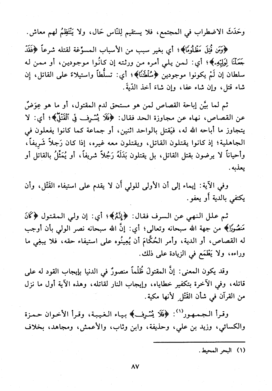 وقد يكون المعنى: إنّ المقتول ظلمًا منصور في الدنيا بإيجاب القود له على قاتله، وفي الآخرة بتكفير خطاياه، وإيجاب النار لقاتله، وهذه الآية أول ما نزل من القرآن في شأن القتل لأنها مكية.