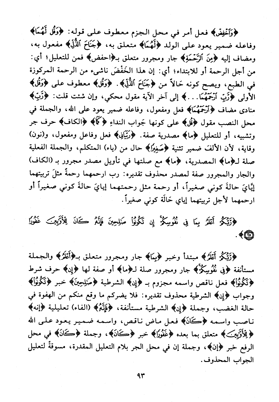 {وَاخْفِضْ} فعل أمر في محل الجزم معطوف على قوله: {وَقُلْ لَهُما} وفاعله ضمير يعود على الولد {لَهُما} متعلق به، {جَناحَ الذُّلِّ} مفعول به، ومضاف إليه {مِنَ الرَّحْمَةِ} جار ومجرور متعلق بـ {اخْفِضْ} فمن للتعليل؛ أي: من أجل الرحمة أو للابتداء؛ أي: إن هذا الخفض ناشىء من الرحمة المركوزة في الطبع، ويصح كونه حالًا من {جَناحَ الذُّلِّ}. {وَقُلْ} معطوف على {وَقُلْ} الأولى {رَبِّ ارْحَمْهُما ...} إلى آخر الآية مقول محكي، وإن شئت قلت: {رَبِّ} منادى مضاف {ارْحَمْهُما} فعل ومفعول، وفاعله ضمير يعود على الله، والجملة في محل النصب مقول {قُلْ} على كونها جواب النداء {كَما} {الكاف} حرف جر وتشبيه، أو للتعليل {ما} مصدرية صفة. {رَبَّيانِي} فعل وفاعل ومفعول، و (نون) وقاية، لأن الألف ضمير تثنية {صَغِيرًا} حال من (ياء) المتكلم، والجملة الفعلية صلة لـ {ما} المصدرية، {ما} مع صلتها في تأويل مصدر مجرور بـ {الكاف} والجار والمجرور صفة لمصدر محذوف تقديره: رب ارحمهما رحمة مثل تربيتهما إيّاي حالة كوني صغيرًا، أو رحمة مثل رحمتهما إياي حالة كوني صغيرًا أو ارحمهما لأجل تربيتهما إياي حالة كوني صغيرًا.