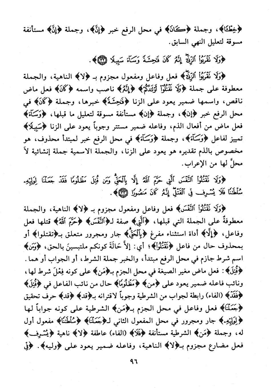 {وَلا تَقْتُلُوا النَّفْسَ} فعل وفاعل ومفعول مجزوم بـ {لا} الناهية، والجملة معطوفة على الجملة التي قبلها، {الَّتِي} صفة لـ {النَّفْسَ} {حَرَّمَ اللَّهُ} قتلها فعل وفاعل، {إِلَّا} أداة استثناء مفرغ {بِالْحَقِّ} جار ومجرور متعلق بـ {تَقْتُلُوا} أو بمحذوف حال من فاعل {تَقْتُلُوا}؛ أي: إلّا حالة كونكم ملتبسين بالحق، {وَمَنْ} اسم شرط جازم في محل الرفع مبتدأ، والخبر جملة الشرط، أو الجواب أو هما. {قُتِلَ}: فعل ماض مغير الصيغة في محل الجزم بـ {مَنْ} على كونه فعل شرط لها، ونائب فاعله ضمير يعود على {مَنْ} {مَظْلُومًا} حال من نائب الفاعل في {قُتِلَ} {فَقَدْ} {الفاء} رابطة لجواب من الشرطية وجوبًا لاقترانه بـ {قد} {قد} حرف تحقيق {جَعَلْنا} فعل وفاعل في محل الجزم بـ {مَنْ} الشرطية على كونه جوابًا لها {لِوَلِيِّهِ} جار ومجرور في محل المفعول الثاني لـ {جَعَلْنا} {سُلْطانًا} مفعول أول له، وجملة {مَنْ} الشرطية مستأنفة {فَلا} {الفاء} عاطفة {لا} ناهية {يُسْرِفْ} فعل مضارع مجزوم بـ {لا} الناهية، وفاعله ضمير يعود على {وليه}. {فِي