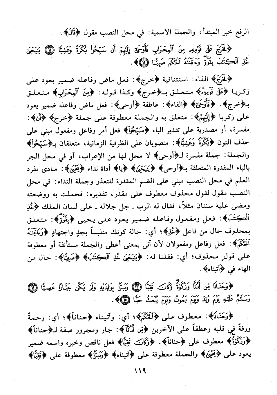 {فَخَرَجَ} الفاء: استئنافية {خَرَجَ}: فعل ماض وفاعله ضمير يعود على زكريا {عَلَى قَوْمِهِ} متعلق بـ {خَرَجَ} وكذا قوله: {مِنَ الْمِحْرَابِ} متعلق بـ {خَرَجَ}. {فَأَوْحَى} {الفاء}: عاطفة {أوحى}: فعل ماض وفاعله ضمير يعود على زكريا {إِلَيْهِمْ}: متعلق به والجملة معطوفة على جملة {خرج} {أَن}: مفسرة، أو مصدرية على تقدير الباء {سَبِّحُوا} فعل أمر وفاعل ومفعول مبني على حذف النون {بُكْرَةً وَعَشِيًّا}: منصوبان على الظرفية الزمانية، متعلقان بـ {سَبِّحُوا} والجملة: جملة مفسرة لـ {أَوْحَى} لا محل لها من الإعراب، أو في محل الجر بالباء المقدرة المتعلقة بـ {أوحى} {يَحْيَى} {يَا} أداة نداء {يَحْيَى}: منادى مفرد العلم في محل النصب مبني على الضم المقدرة للتعذر وجملة النداء: في محل النصب مقول لقول محذوف معطوف على مقدر، تقديره: فحملت به ووضعته ومضى عليه سنتان مثلاً، فقال له الرب - جل جلاله - على لسان الملك {خُذِ الْكِتَابَ}: فعل ومفعول وفاعله ضمير يعود على يحيى {بِقُوَّةٍ}: متعلق بمحذوف حال من فاعل {خُذِ}؛ أي: حالة كونك متلبسًا بجدٍ واجتهادٍ {وَآتَيْنَاهُ الْحُكْمَ}: فعل وفاعل ومفعولان لأن آتى بمعنى أعطى والجملة مستأنفة أو معطوفة على قولٍ محذوف؛ أي: فقلنا له: {يَا يَحْيَى خُذِ الْكِتَابَ} {صَبِيًّا}: حال من الهاء في {آتَيْنَاهُ}.