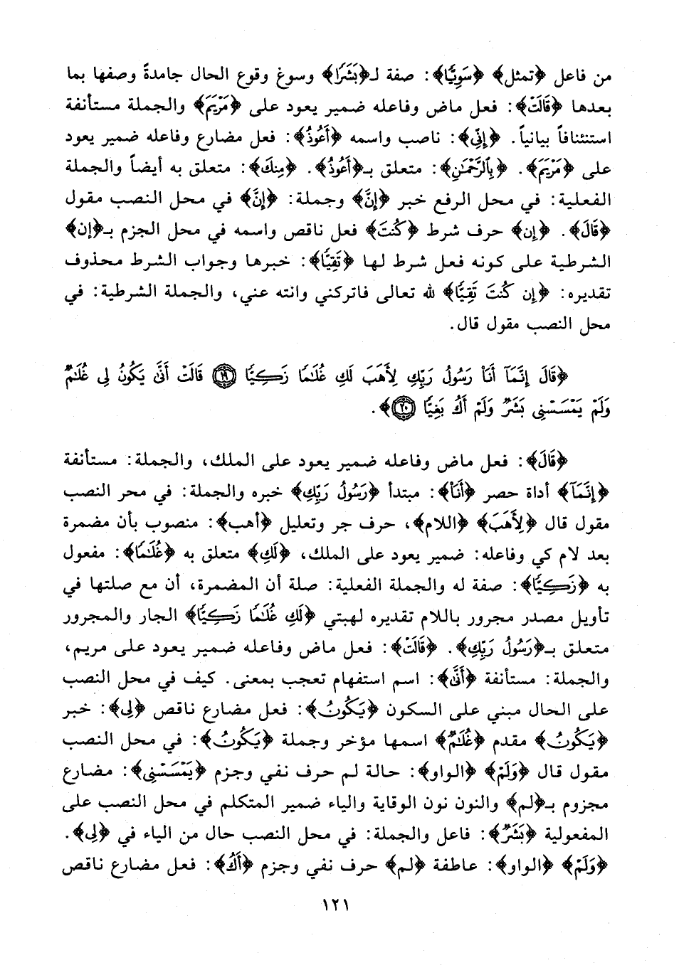 {قَالَ}: فعل ماض وفاعله ضمير يعود على الملك، والجملة: مستأنفة {إِنَّمَا} أداة حصر {أَنَا}: مبتدأ {رَسُولُ رَبِّكِ} خبره والجملة: في بحر النصب مقول قال {لِأَهَبَ} {اللام}، حرف جر وتعليل {أَهَبَ}: منصوب بأن مضمرة بعد لام كي وفاعله: ضمير يعود على الملك، {لَكِ} متعلق به {غُلَامًا}: مفعول به {زَكِيًّا}: صفة له والجملة الفعلية: صلة أن المضمرة، أن مع صلتها في تأويل مصدر مجرور باللام تقديره لهبتي {لَكِ غُلَامًا زَكِيًّا} الجار والمجرور متعلق بـ {رَسُولُ رَبِّكِ}. {قَالَتْ}: فعل ماض وفاعله ضمير يعود على مريم، والجملة: مستأنفة {أَنَّى}: اسم استفهام تعجب بمعنى. كيف في محل النصب على الحال مبني على السكون {يَكُونُ}: فعل مضارع ناقص {لِي}: خبر {يَكُونُ} مقدم {غُلَامٌ} اسمها مؤخر وجملة {يَكُونُ}: في محل النصب مقول قال {وَلَمْ} {الواو}: حالة لم حرف نفي وجزم {يَمْسَسْنِي}: مضارع مجزوم بـ {لَمْ} والنون نون الوقاية والياء ضمير المتكلم في محل النصب على المفعولية {بَشَرٌ}: فاعل والجملة: في محل النصب حال من الياء في {لِي}. {وَلَمْ} {الواو}: عاطفة {لَمْ} حرف نفي وجزم {أَكُ}: فعل مضارع ناقص