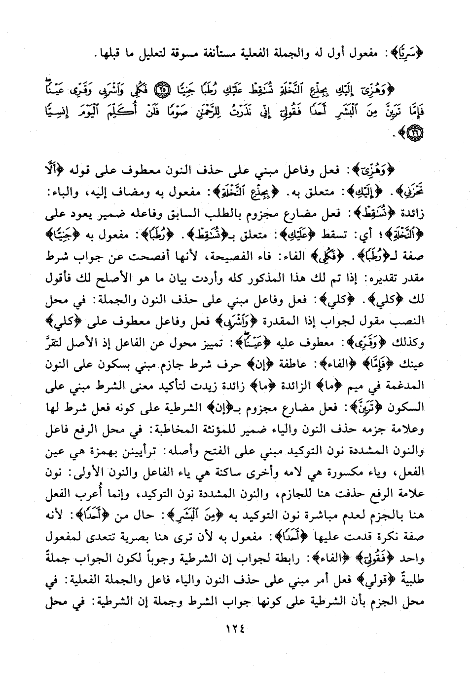 {وَهُزِّي}: فعل وفاعل مبني على حذت النون معطوف على قوله {أَلَّا تَحْزَنِي}. {إِلَيْكِ}: متعلق به. {بِجِذْعِ النَّخْلَةِ}: مفعول به ومضاف إليه، والباء: زائدة {تُسَاقِطْ}: فعل مضارع مجزوم بالطلب السابق وفاعله ضمير يعود على {النَّخْلَةِ}؛ أي: تسقط {عَلَيْكِ}: متعلق بـ {تُسَاقِطْ}. {رُطَبًا}: مفعول به {جَنِيًّا} صفة لـ {رُطَبًا}. {فَكُلِي} الفاء: فاء الفصيحة؛ لأنها أفصحت عن جواب شرط مقدر تقديره: إذا تم لك هذا المذكور كله وأردت بيان ما هو الأصلح لك فأقول لك {كلي}. {كلي}: فعل وفاعل مبني على حذف النون والجملة: في محل النصب مقول لجواب إذا المقدرة {وَاشْرَبِي} فعل وفاعل معطوف على {كلي} وكذلك {وَقَرِّي}: معطوف عليه {عَيْنًا}: تمييز محول عن الفاعل إذ الأصل لتقرَّ عينك {فَإِمَّا} {الفاء}: عاطفة {إن} حرف شرط جازم مبني بسكون على النون المدغمة في ميم {ما} الزائدة {ما} زائدة زيدت لتأكيد معنى الشرط مبني على السكون {تَرَيِنَّ}: فعل مضارع مجزوم بـ {إن} الشرطية على كونه فعل شرط لها وعلامة جزمه حذف النون وإلياء ضمير للمؤنثة المخاطبة: في محل الرفع فاعل والنون المشددة نون التوكيد مبني على الفتح وأصله: ترأيينن بهمزة هي عين الفعل، وياء مكسورة هي لامه وأخرى ساكنة هي ياء الفاعل والنون الأولى: نون علامة الرفع حذفت هنا للجازم، والنون المشددة نون التوكيد، وإنما أُعرب الفعل هنا بالجزم لعدم مباشرة نون التوكيد به {مِنَ الْبَشَرِ}: حال من {أَحَدًا}: لأنه صفة نكرة قدمت عليها {أَحَدًا}: مفعول به لأن ترى هنا بصرية تتعدى لمفعول واحد {فَقُولِي} {الفاء}: رابطة لجواب إن الشرطية وجوبًا لكون الجواب جملةً طلبيةً {قولي} فعل أمر مبني على حذف النون والياء فاعل والجملة الفعلية: في محل الجزم بأن الشرطية على كونها جواب الشرط وجملة إن الشرطية: في محل
