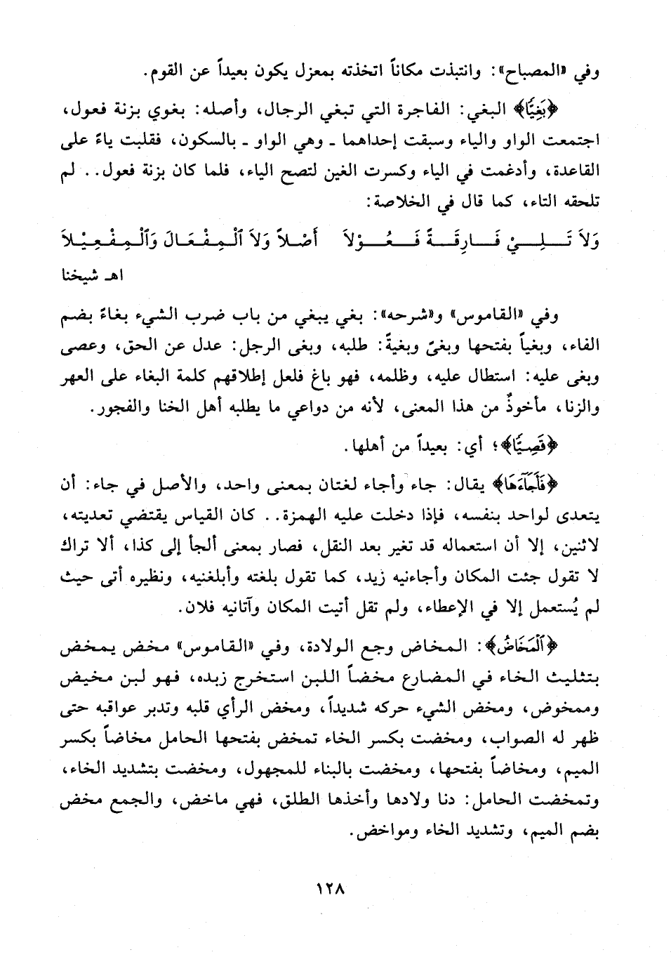 {بَغِيًّا} البغي: الفاجرة التي تبغي الرجال، وأصله: بغوي بزنة فعول، اجتمعت الواو والياء وسبقت إحداهما - وهي الواو - بالسكون، فقلبت ياءً على القاعدة، وأدغمت في الياء وكسرت الغين لتصح الياء، فلما كان بزنة فعول .. لم تلحقه التاء، كما قال في الخلاصة: