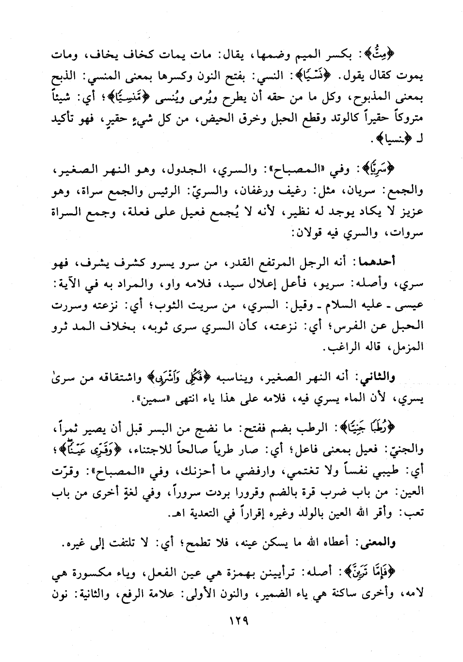 {سَرِيًّا}: وفي "المصباح": والسري، الجدول، وهو النهر الصغير, والجمع: سريان، مثل: رغيف ورغفان، والسريّ: الرئيس والجمع سراة، وهو عزيز لا يكاد يوجد له نظير؛ لأنه لا يُجمع فعيل على فعلة، وجمع السراة سروات، والسري فيه قولان: