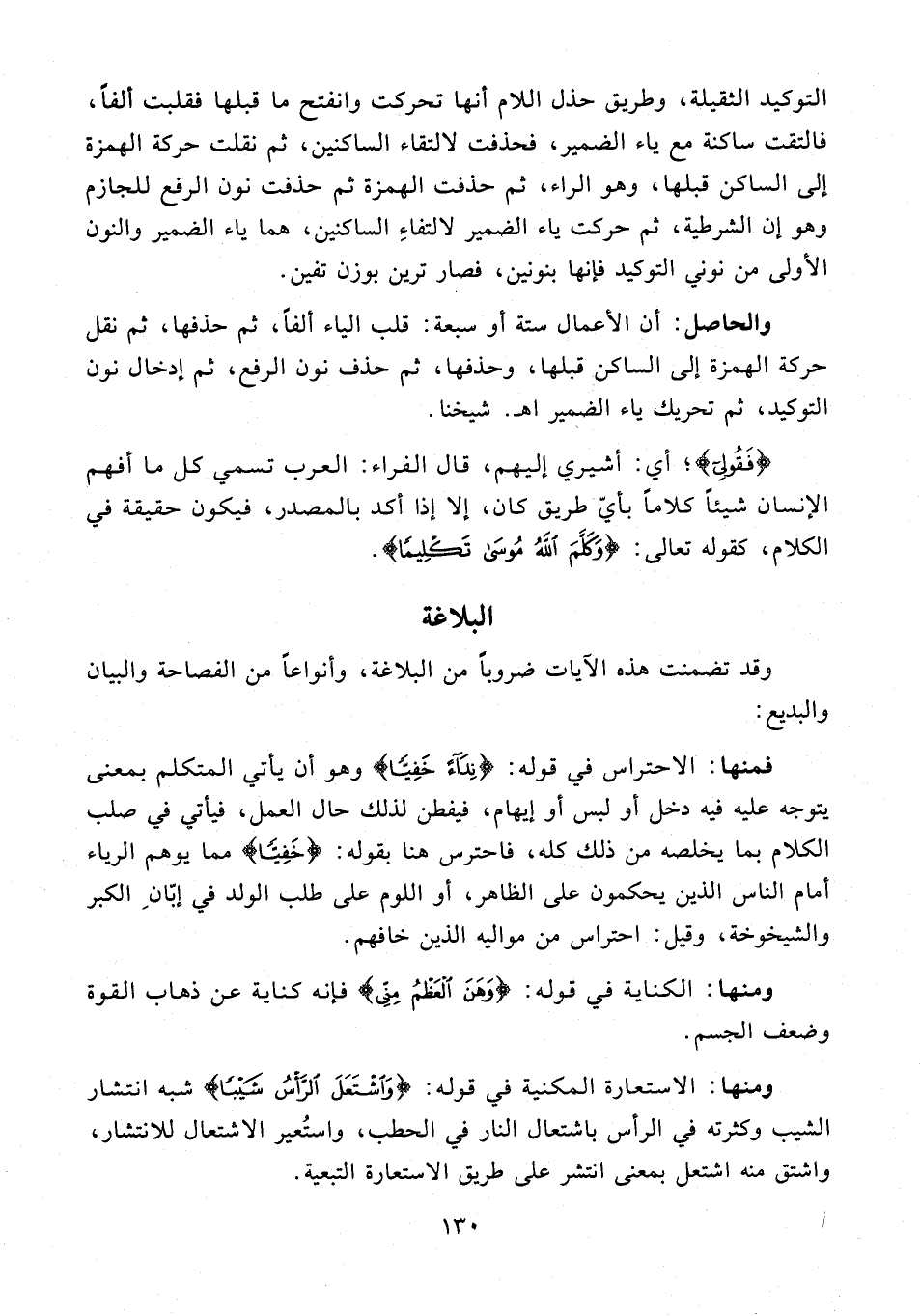 فمنها: الاحتراس في قوله: {نِدَاءً خَفِيًّا} وهو أن يأتي المتكلم بمعنى يتوجه عليه فيه دخل أو لبس أو إيهام، فيفطن لذلك حال العمل، فيأتى في صلب الكلام بما يخلصه من ذلك كله، فاحترس هنا بقوله: {خَفِيًّا} مما يوهم الرياء أمام الناس الذين يحكمون على الظاهر، أو اللوم على طلب الولد في إبّانِ الكبر والشيخوخة، وقيل: احتراس من مواليه الذين خافهم.