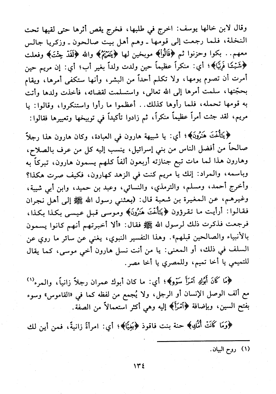 {يَا أُخْتَ هَارُونَ}؛ أي: يا شبيهة هارون في العبادة، وكان هارون هذا رجلًا صالحًا من أفضل الناس من بني إسرائيل، ينسب إليه كل من عرف بالصلاح، وهارون هذا لما مات تبع جنازته أربعون ألفًا كلهم يسمون هارون، تبركًا به وباسمه، والمراد: إنك يا مريم كنت في الزهد كهارون، فكيف صرت هكذا؟ وأخرج أحمد، ومسلم، والترمذي، والنسائي، وعبد بن حميد، وابن أبي شيبة، وغيرهم، عن المغيرة بن شعبة قال: (بعثني رسول الله - صلى الله عليه وسلم - إلى أهل نجران فقالوا: أرأيت ما تقرؤون {يَا أُخْتَ هَارُونَ} وموسى قبل عيسى بكذا بكذا، فرجعت فذكرت ذلك لرسول الله - صلى الله عليه وسلم - فقال: "ألا أخبرتهم أنهم كانوا يسمون بالأنبياء والصالحين قبلهم". وهذا التفسير النبوي، يغني عن سائر ما روي عن السلف في ذلك، أو المعنى: يا من أنت نسل هارون أخي موسى، كما يقال للتميمي يا أخا تميم، وللمصري يا أخا مصر.