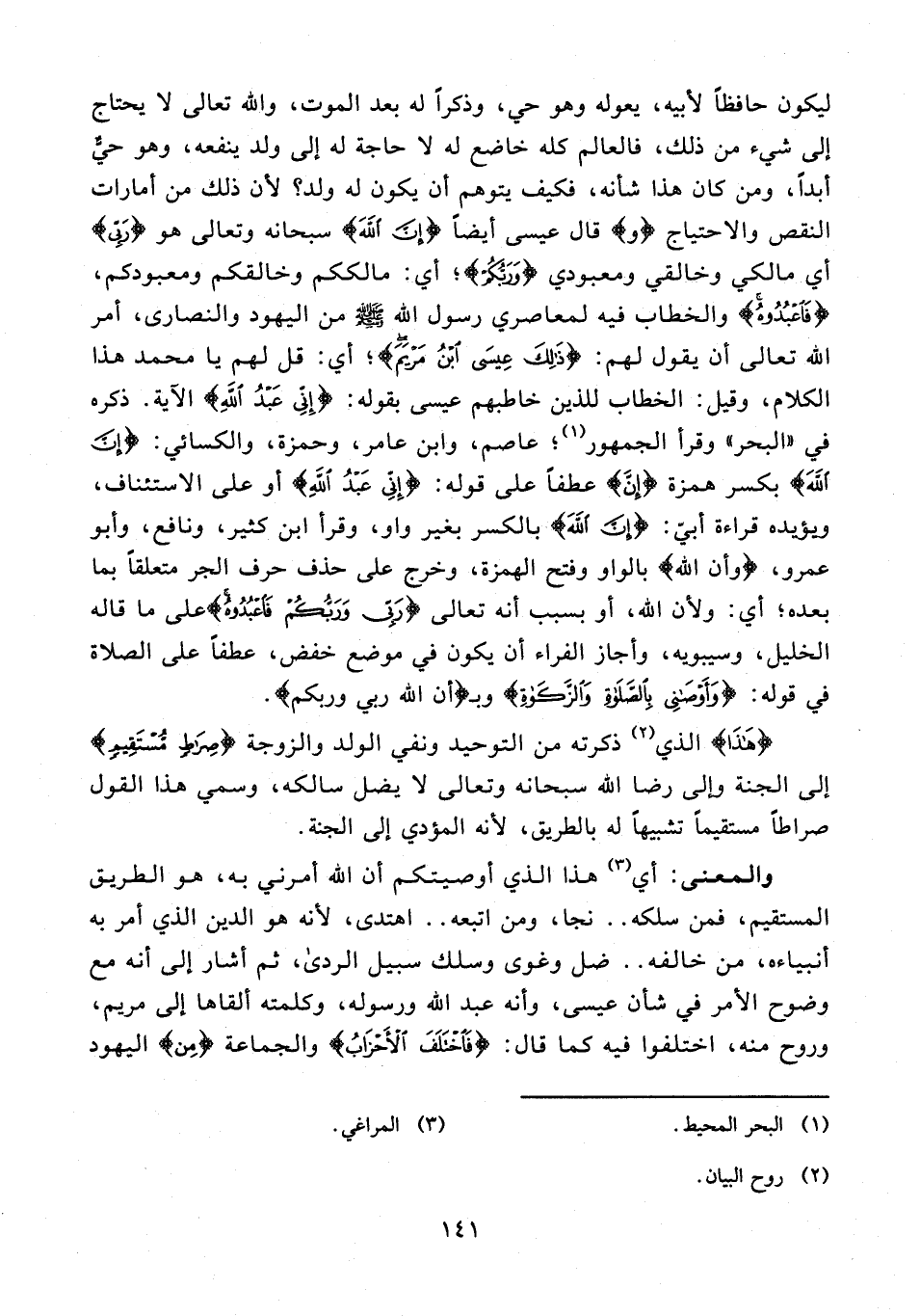 36 - {وَ} قال عيسى أيضًا {إِنَّ اللَّهَ} سبحانه وتعالى هو {رَبِّي} أي مالكي وخالقي ومعبودي {وَرَبُّكُمْ}؛ أي: مالككم وخالقكم ومعبودكم، {فَاعْبُدُوهُ} والخطاب فيه لمعاصري رسول الله - صلى الله عليه وسلم - من اليهود والنصارى، أمر الله تعالى أن يقول لهم: {ذَلِكَ عِيسَى ابْنُ مَرْيَمَ}؛ أي: قل لهم يا محمد هذا الكلام، وقيل: الخطاب للذين خاطبهم عيسى بقوله: {إِنِّي عَبْدُ اللَّهِ} الآية. ذكره في "البحر" وقرأ الجمهور (¬1)؛ عاصم، وابن عامر، وحمزة، والكسائي: {إِنَّ اللَّهَ} بكسر همزة {إِنَّ} عطفًا على قوله: {إِنِّي عَبْدُ اللَّهِ} أو على الاستئناف، ويؤيده قراءة أبيّ: {إِنَّ اللَّهَ} بالكسر بغير واو، وقرأ ابن كثير، ونافع، وأبو عمرو، {وأن الله} بالواو وفتح الهمزة، وخرج على حذف حرف الجر متعلقًا بما بعده؛ أي: ولأن الله، أو بسبب أنه تعالى {رَبِّي وَرَبُّكُمْ فَاعْبُدُوهُ} على ما قاله الخليل، وسيبويه، وأجاز الفراء أن يكون في موضع خفض، عطفًا على الصلاة في قوله: {وَأَوْصَانِي بِالصَّلَاةِ وَالزَّكَاةِ} وبـ {إِنَّ اللَّهَ رَبِّي وَرَبُّكُمْ}.