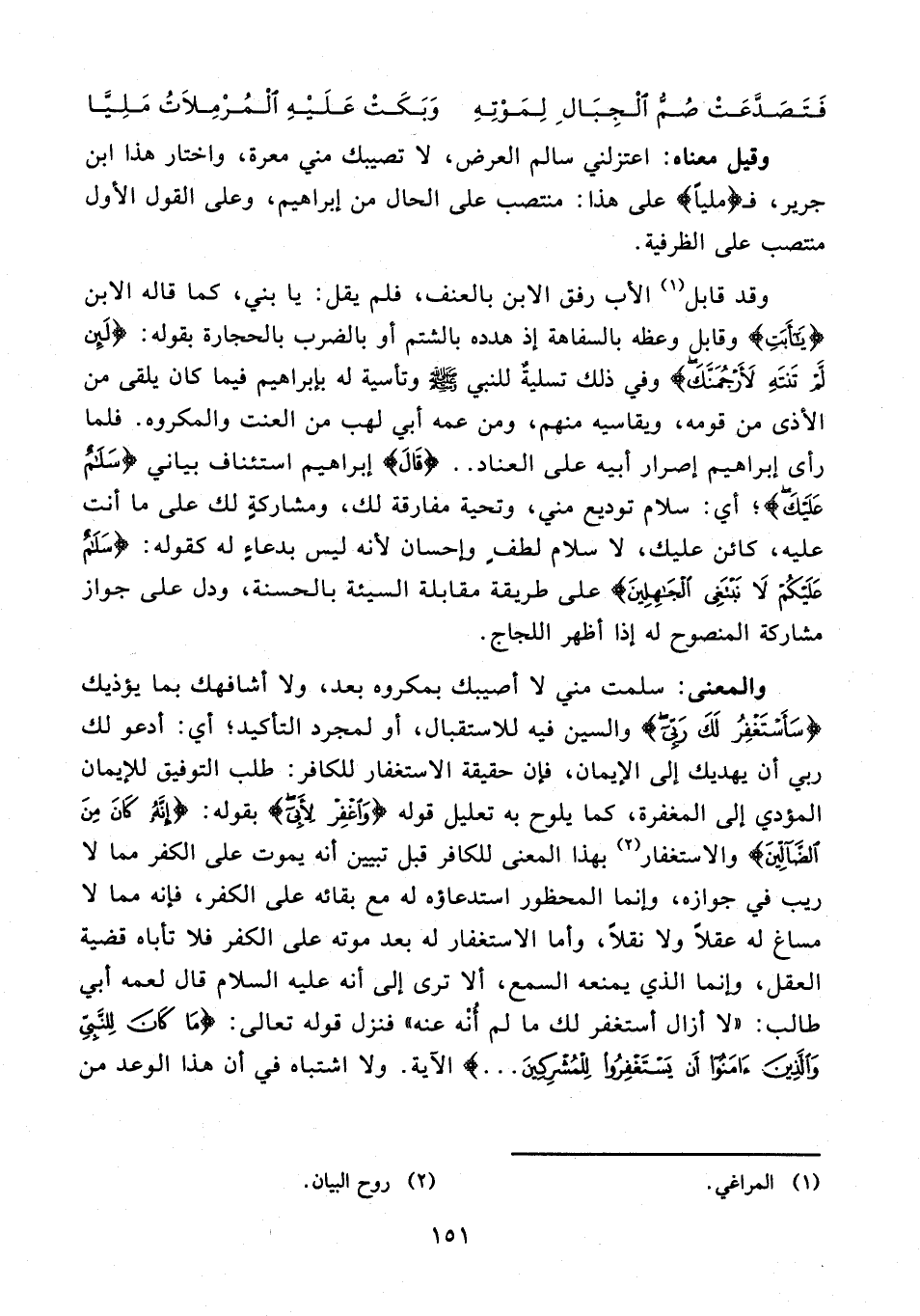 47 - فلما رأى إبراهيم إصرار أبيه على العناد .. {قَالَ} إبراهيم استئناف بياني {سَلَامٌ عَلَيْكَ}؛ أي: سلام توديع مني، وتحية مفارقة لك، ومشاركةٍ لك على ما أنت عليه، كائن عليك، لا سلام لطفٍ وإحسان لأنه ليس بدعاءٍ له كقوله: {سَلَامٌ عَلَيْكُمْ لَا نَبْتَغِي الْجَاهِلِينَ} على طريقة مقابلة السيئة بالحسنة، ودل على جواز مشاركة المنصوح له إذا أظهر اللجاج.