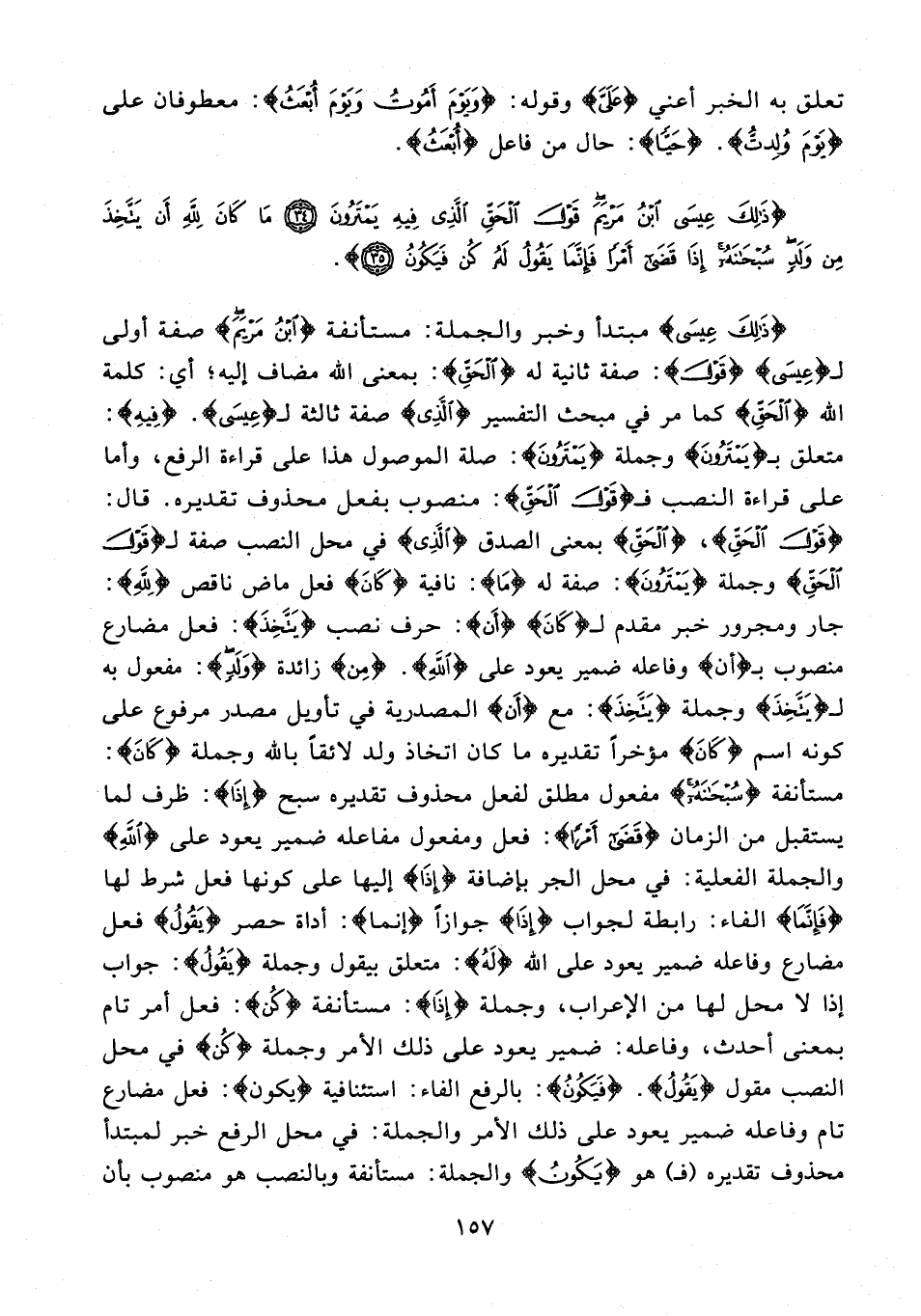 {ذَلِكَ عِيسَى} مبتدأ وخبر والجملة: مستأنفة {ابْنُ مَرْيَمَ} صفة أولى لـ {عِيسَى} {قَوْلَ}: صفة ثانية له {الْحَقِّ}: بمعنى الله مضاف إليه؛ أي: كلمة الله {الْحَقِّ} كما مر في مبحث التفسير {الَّذِي} صفة ثالثة لـ {عِيسَى}. {فِيهِ}: متعلق بـ {يَمْتَرُونَ} وجملة {يَمْتَرُونَ}: صلة الموصول هذا على قراءة الرفع، وأما على قراءة النصب فـ {قَوْلَ الْحَقِّ}: منصوب بفعل محذوف تقديره. قال: {قَوْلَ الْحَقِّ}، {الْحَقِّ} بمعنى الصدق {الَّذِي} في محل النصب صفة لـ {قَوْلَ الْحَقِّ} وجملة {يَمْتَرُونَ}: صفة له {مَا}: نافية {كَانَ} فعل ماض ناقص {لِلَّهِ}: جار ومجرور خبر مقدم لـ {كَانَ} {أَنْ}: حرف نصب {يَتَّخِذَ}: فعل مضارع منصوب بـ {أن} وفاعله ضمير يعود على {اللهِ}. {مِنْ} زائدة {وَلَدٍ}: مفعول به لـ {يَتَّخِذَ} وجملة {يَتَّخِذَ}: مع {أَن} المصدرية في تأويل مصدر مرفوع على كونه اسم {كَانَ} مؤخرًا تقديره ما كان اتخاذ ولد لائقًا بالله وجملة {كَانَ}: مستأنفة {سُبْحَانَهُ} مفعول مطلق لفعل محذوف تقديره سبح {إِذَا}: ظرف لما يستقبل من الزمان {قَضَى أَمْرًا}: فعل ومفعول مفاعله ضمير يعود على {اللهِ} والجملة الفعلية: في محل الجر بإضافة {إِذَا} إليها على كونها فعل شرط لها {فَإِنَّمَا} الفاء: رابطة لجواب {إِذَا} جوازًا {إِنَّمَا}: أداة حصر {يَقُولُ} فعل مضارع وفاعله ضمير يعود على الله {لَهُ}: متعلق بيقول وجملة {يَقُولُ}: جواب إذا لا محل لها من الإعراب، وجملة {إِذَا}: مستأنفة {كُنْ}: فعل أمر تام بمعنى أحدث، وفاعله: ضمير يعود على ذلك الأمر وجملة {كُنْ} في محل النصب مقول {يَقُولُ}. {فَيَكُونُ}: بالرفع الفاء: استئنافية {يَكُونُ}: فعل مضارع تام وفاعله ضمير يعود على ذلك الأمر والجملة: في محل الرفع خبر لمبتدأ محذوف تقديره (فـ) هو {يَكُونُ} والجملة: مستأنفة وبالنصب هو منصوب بأن
