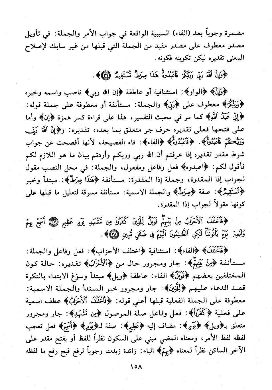 {وَإِنَّ} {الواو}: استئنافية أو عاطفة {إِنَّ اللَّهَ رَبِّي} ناصب واسمه وخبره {وَرَبُّكُمْ} معطوف على {رَبِّي} والجملة: مستأنفة أو معطوفة على جملة قوله: {إِنِّي عَبْدُ اللَّهِ} كما مر في محبث التفسير، هذا على قراءة كسر همزة {إن} وأما على فتحها فعلى تقديره حرف جر متعلق بما بعده، تقديره: و {وَإِنَّ اللَّهَ رَبِّي وَرَبُّكُمْ فَاعْبُدُوهُ}. {فَاعْبُدُوهُ} {الفاء}: فاء الفصيحة؛ لأنها أفصحت عن جواب شرط مقدر تقديره إذا عرفتم أن الله ربي وربكم وأردتم بيان ما هو اللازم لكم فأقول لكم: {اعبدوه} فعل وفاعل ومفعول، والجملة: في محل النصب مقول لجواب إذا المقدرة، وجملة إذا المقدرة: مستأنفة {هَذَا صِرَاطٌ}: مبتدأ وخبر {مُسْتَقِيمٌ}: صفة {صِرَاطٌ} والجملة الاسمية: مستأنفة مسوقة لتعليل ما قبلها على كونها مقولًا لجواب إذا المقدرة.