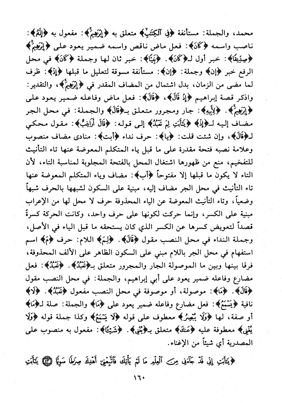محمد، والجملة: مستأنفة {فِي الْكِتَابِ} متعلق به {إِبْرَاهِيمَ}: مفعول به {إِنَّهُ}: ناصب واسمه {كَانَ}: فعل ماض ناقص واسمه ضمير يعود على {إِبْرَاهِيمَ} {صِدِّيقًا}: خبر أول لـ {كَانَ}. {نَبِيًّا}: خبر ثان لها وجملة {كَانَ} أى محل الرفع خبر {إن} وجملة: {إن}: مستأنفة مسوقة لتعليل ما قبلها {إِذْ}: ظرف لما مضى أو الزمان، بدل اشتمال أو المضاف المقدر أى {إِبْرَاهِيمَ}، والتقدير: واذكر قصة إبراهيم {إِذْ قَالَ}، {قَالَ}: فعل ماض وفاعله ضمير يعود على {إِبْرَاهِيمَ}. {لِأَبِيهِ}: جار ومجرور متعلق بـ {قَالَ} والجملة: أى محل الجر مضاف إليه لـ {إِذْ} {يَا أَبَتِ لِمَ تَعْبُدُ} إلى قوله: {قَالَ أَرَاغِبٌ}: مقول محكي لـ {قَالَ}، وإن شئت قلت: {يا}: حرف نداء {أبت}: منادى مضاف منصوب وعلامة نصبه فتحة مقدرة على ما قبل ياء المتكلم المعوضة عنها تاء التأنيث للتفخيم، منع من ظهورها اشتغال المحل بالفتحة المجلوبة لمناسبة التاء؛ لأن التاء لا يكون ما قبلها إلا مفتوحًا {أب}: مضاف وياء المتكلم المعوضة عنها تاء التأنيث أى محل الجر مضاف إليه، مبنية على السكون لشبهها بالحرف شبهًا وضعيًا، وتاء التأنيث المعوضة عن الياء المحذوفة حرف لا محل لها من الإعراب مبنية على الكسر، وإنما حركت لكونها على حرف واحد، وكانت الحركة كسرةً قصدًا لتعويض كسرها عن الكسر الذي كان يستحقه ما قبل الياء أى الأصل، وجملة النداء أى محل النصب مقول {قَالَ}. {لِمَ} اللام: حرف {مَ} اسم استفهام أى محل الجر باللام مبني على السكون الظاهر على الألف المحذوفة، فرقا بينها وبين ما الموصولة الجار والمجرور متعلق بـ {تَعْبُدُ}. {تَعْبُدُ}: فعل مضارع وفاعله ضمير يعود على أبي إبراهيم، والجملة: أى محل النصب مقول {قَالَ}. {مَا}: موصولة، أو موصوفة أى محل النصب مفعول {تَعْبُدُ}. {لَا} نافية {يَسْمَعُ}: فعل مضارع وفاعله ضمير يعود على {مَا} والجملة: صلة لـ {مَا} أو صفة، لها {وَلَا يُبْصِرُ} معطوف على قوله {لَا يَسْمَعُ} وكذا جملة قوله {وَلَا يُغْنِي} معطوفة عليه {عَنْكَ} متعلق بـ {يُغْنِي}. {شَيْئًا}: مفعول به منصوب على المصدرية أى شيئًا أو الإغناء.