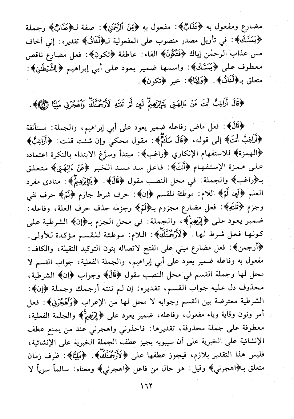 {قَالَ}: فعل ماض وفاعله ضمير يعود على أبي إبراهيم، والجملة: مستأنفة {أَرَاغِبٌ أَنْتَ} إلى قوله، {قَالَ سَلَامٌ}: مقول محكي وإن شئت قلت: {أَرَاغِبٌ} {الهمزة} للاستفهام الإنكاري {راغب}: مبتدأ وسوَّغ الابتداء بالنكرة اعتماده على همزة الإستفهام {أَنْتَ}: فاعل سد مسد الخبر {عَنْ آلِهَتِي} متعلق بـ {راغب} والجملة: في محل النصب مقول {قَالَ}. {يَا إِبْرَاهِيمُ}: منادى مفرد العلم {لَئِنْ لَم} اللام: موطئة للقسم {إن}: حرف شرط جازم {لَمْ} حرف نفي وجزم {تَنْتَهِ}؛ فعل مضارع مجزوم بـ {لَمْ} وجزمه حذف حرف العلة، وفاعله: ضمير يعود على {إِبْرَاهِيمُ}، والجملة: في محل الجزم بـ {إن} الشرطية على كونها فعل شرط لها. {لَأَرْجُمَنَّكَ}: اللام: موطئة للقسم مؤكدة للأولى. {أرجمن}: فعل مضارع مبني على الفتح لاتصاله بنون التوكيد الثقيلة، والكاف: مفعول به وفاعله ضمير يعود على أبي إبراهيم، والجملة الفعلية، جواب القسم لا محل لها وجملة القسم في محل النصب مقول {قَالَ} وجواب {إن} الشرطية، محذوف دل عليه جواب القسم، تقديره: إن لم تنته أرجمك وجملة {إن}: الشرطية معترضة بين القسم وجوابه لا محل لها من الإعراب {وَاهْجُرْنِي}: فعل أمر ونون وقاية وياء مفعول، وفاعله، ضمير يعود على {إِبْرَاهِيمُ} والجلمة الفعلية، معطوفة على جملة محذوفة، تقديرها: فاحذرني واهجرني عند من يمنع عطف الإنشائية على الخبرية على أن سيبويه يجيز عطف الجملة الخبرية على الإنشائية، فليس هذا التقدير بلازم، فيجوز عطفها على {لَأَرْجُمَنَّكَ}. {مَلِيًّا}: ظرف زمان متعلق بـ {اهجرني} وقيل: هو حال من فاعل {اهجرني} ومعناه: سالمًا سويًا لا