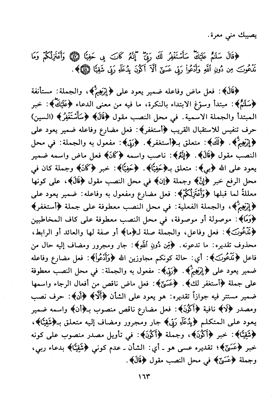 {قَالَ}: فعل ماض وفاعله ضمير يعود على {إِبْرَاهِيمُ}، والجملة: مستأنفة {سَلَامٌ}: مبتدأ وسوّغ الابتداء بالنكرة، ما فيه من معنى الدعاء {عَلَيْكَ}: خبر المبتدأ والجملة الاسمية. في محل النصب مقول {قَالَ} {سَأَسْتَغْفِرُ} (السين) حرف تنفيس للاستقبال القريب {أستغفر}: فعل مضارع وفاعله ضمير يعود على {إِبْرَاهِيمُ}. {لَكَ}: متعلق بـ {أستغفر}. {رَبِّي}: مفعول به والجملة: في محل النصب مقول {قَالَ}. {إِنَّهُ}: ناصب واسمه {كَانَ} فعل ماض واسمه ضمير يعود على الله {بِي}: متعلق بـ {حَفِيًّا}. {حَفِيًّا}: خبر {كَانَ} وجملة كان في محل الرفع خبر {إِنَّ} وجملة {إن} في محل النصب مقول {قَالَ}، على كونها معللةً لما قبلها {وَأَعْتَزِلُكُمْ}: فعل مضارع ومفعول به وفاعله: ضمير يعود على {إِبْرَاهِيمُ}، والجملة الفعلية: في محل النصب معطوفة على جملة {أستغفر} {وَمَا}: موصولة أو موصوفة، في محل النصب معطوفة على كاف المخاطبين {تَدْعُونَ}: فعل وفاعل، والجملة صلة لـ {ما} أو صفة لها والعائد أو الرابط، محذوف تقديره: ما تدعونه. {مِنْ دُونِ اللَّهِ}: جار ومجرور ومضاف إليه حال من فاعل {تَدْعُونَ}: أي: حالة كونكم مجاوزين الله {وَأَدْعُو}: فعل مضارع وفاعله ضمير يعود على {إِبْرَاهِيمُ}. {رَبِّي}: مفعول به والجملة: في محل النصب معطوفة على جملة {أستغفر لك}. {عَسَى}: فعل ماض ناقص من أفعال الرجاء واسمها ضمير مستتر فيه جوازًا تقديره: هو يعود على الشأن {أَلَّا} {أَن}: حرف نصب ومصدر {لَّا} نافية {أَكُونَ}: فعل مضارع ناقص منصوب بـ {أن} واسمه ضمير يعود على المتكلم {بِدُعَاءِ رَبِّي} جار ومجرور ومضاف إليه متعلق بـ {شَقِيًّا}، {شَقِيًّا}: خبر {أَكُونَ}، وجملة {أَكُونَ}: في تأويل مصدر منصوب على كونه خبر {عَسَى}؛ تقديره عسى هو - أي: الشأن - عدم كوني {شَقِيًّا} بدعاء ربي، وجملة {عَسَى} في محل النصب مقول {قَالَ}.