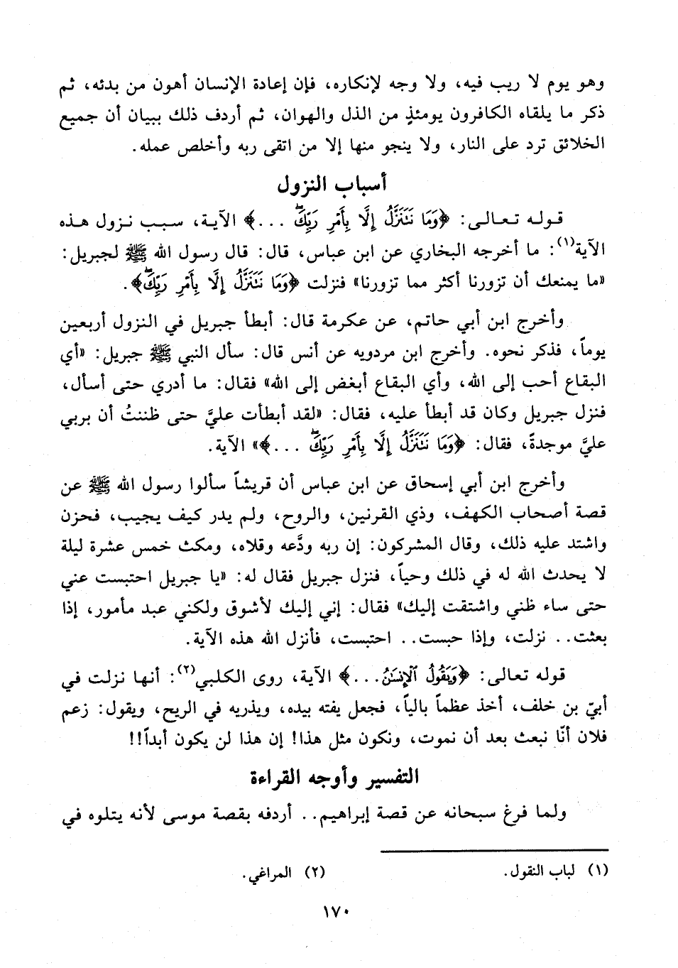 وأخرج ابن أبي إسحاق عن ابن عباس أن قريشاً سألوا رسول الله - صلى الله عليه وسلم - عن قصة أصحاب الكهف، وذي القرنين، والروح، ولم يدر كيف يجيب، فحزن واشتد عليه ذلك، وقال المشركون: إن ربه ودَّعه وقلاه، ومكث خمس عشرة ليلة لا يحدث الله له في ذلك وحيًّا، فنزل جبريل فقال له: "يا جبريل احتبست عني حتى ساء ظني واشتقت إليك" فقال: إني إليك لأشوق ولكني عبد مأمور، إذا بعثت .. نزلت، وإذا حبست .. احتبست، فأنزل الله هذه الآية.