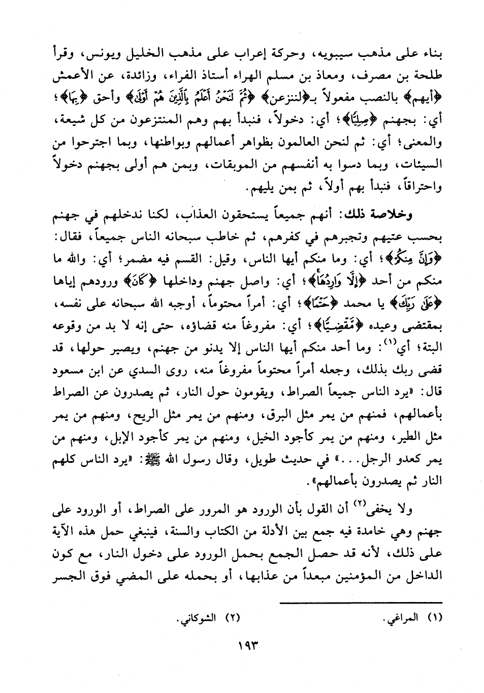 ولا يخفى (¬2) أن القول بأن الورود هو المرور على الصراط، أو الورود على جهنم وهي خامدة فيه جمع بين الأدلة من الكتاب والسنة، فينبغي حمل هذه الآية على ذلك؛ لأنه قد حصل الجمع بحمل الورود على دخول النار، مع كون الداخل من المؤمنين مبعدًا من عذابها، أو بحمله على المضي فوق الجسر
