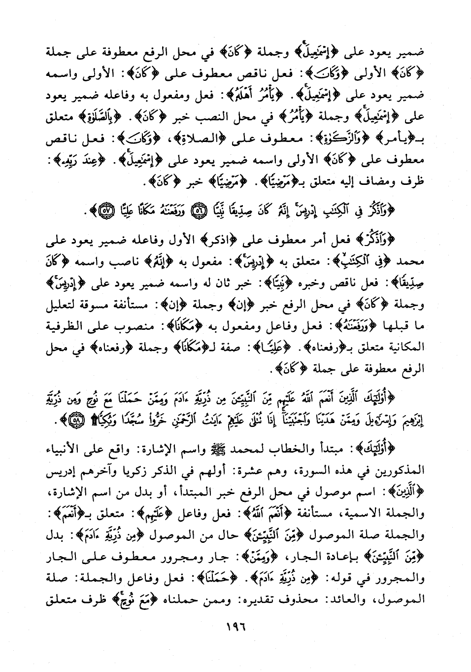 {أُولَئِكَ}: مبتدأ والخطاب لمحمد - صلى الله عليه وسلم - واسم الإشارة: واقع على الأنبياء المذكورين في هذة السورة, وهم عشرة: أولهم في الذكر زكريا وآخرهم إدريس {الَّذِينَ} اسم موصول في نحل الرفع خبر المبتدأ, أو بدل من اسم الإشارة, والجملة الاسمية, مستأنفة {أَنْعَمَ الله}: فعل وفاعل {عَلَيْهِمْ}: متعلق بـ {أَنْعَمَ}: والجملة صلة الموصول {مِنَ النَّبِيِّينَ} حال من الموصول {مِنْ ذُرِّيَّةِ آدَمَ}: بدل {مِنَ النَّبِيِّينَ} بإعادة الجار, {وَمِمَّنْ}: جار ومجرور معطوف على الجار والمجرور في قوله: {مِنْ ذُرِّيَّةِ آدَمَ}. {حَمَلْنَا}: فعل وفاعل والجملة: صلة الموصول, والعائد: محذوف تقديره: وممن حملناه {مَعَ نُوحٍ} ظرف متعلق