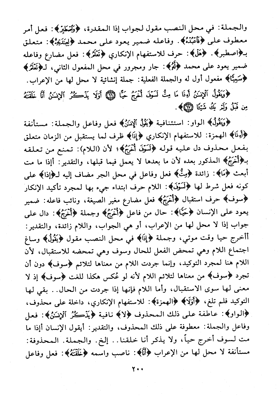 {وَيَقُولُ} الواو: استئنافية {يَقُولُ الْإِنْسَانُ} فعل وفاعل والجملة: مستأنفة {إِذَا} الهمزة: للاستفهام الإنكاري {إِذَا} ظرف لما يستقبل من الزمان متعلق بفعل محذوف دل عليه قوله {لَسَوْفَ أُخْرَجُ}؛ لأن (اللام): تمنع من تعلقه بـ {أُخْرَجُ} المذكور بعده لأن ما بعدها لا يعمل فيما قبلها، والتقدير: أإذا ما مت أبعث {مَا}: زائدة {مِتُّ} فعل وفاعل في محل الجر مضاف إليه لـ {إذا} على كونه فعل شرط لها {لَسَوْفَ}: اللام حرف ابتداء جيء بها لمجرد تأكيد الإنكار {سوف} حرف استقبال {أُخْرَجُ} فعل مضارع مغير الصيغة، ونائب فاعله: ضمير يعود على الإنسان {حَيًّا}: حال من فاعل {أُخْرَجُ} وجملة {أُخْرَجُ}: دال على جواب إذا لا محل لها من الإعراب، أو هي الجواب، واللام زائدة، والتقدير: أأخرج حيا وقت موتي، وجملة {إِذَا} في محل النصب مقول {يَقُولُ} وساغ اجتماع اللام وهي تمحض الفعل للحال وسوف وهي تمحضه للاستقبال؛ لأن اللام هنا لمجرد التوكيد، وإنما جردت اللام من معناها لتلائم {سوف} دون أن تجرد {سوف} من معناها لتلائم اللام لأنه لو عُكس هكذا للغت {سوف} إذ لا معنى لها سوى الاستقبال، وأما اللام فإنها إذا جردت من الحال .. بقي لها التوكيد فلم تلغ، {أَوَلَا} {الهمزة}: للاستفهام الإنكاري، داخلة على محذوف، {الواو}: عاطفة على ذلك المحذوف {لا} نافية {يَذْكُرُ الْإِنْسَانُ}: فعل وفاعل والجملة: معطوفة على ذلك المحذوف، والتقدير: أيقول الإنسان أإذا ما مت لسوف أخرج حيًا، ولا يذكر أنا خلقنا .. إلخ. والجملة. المحذوفة: مستأنفة لا محل لها من الإعراب {أَنَّا}: ناصب واسمه {خَلَقْنَاهُ}: فعل وفاعل