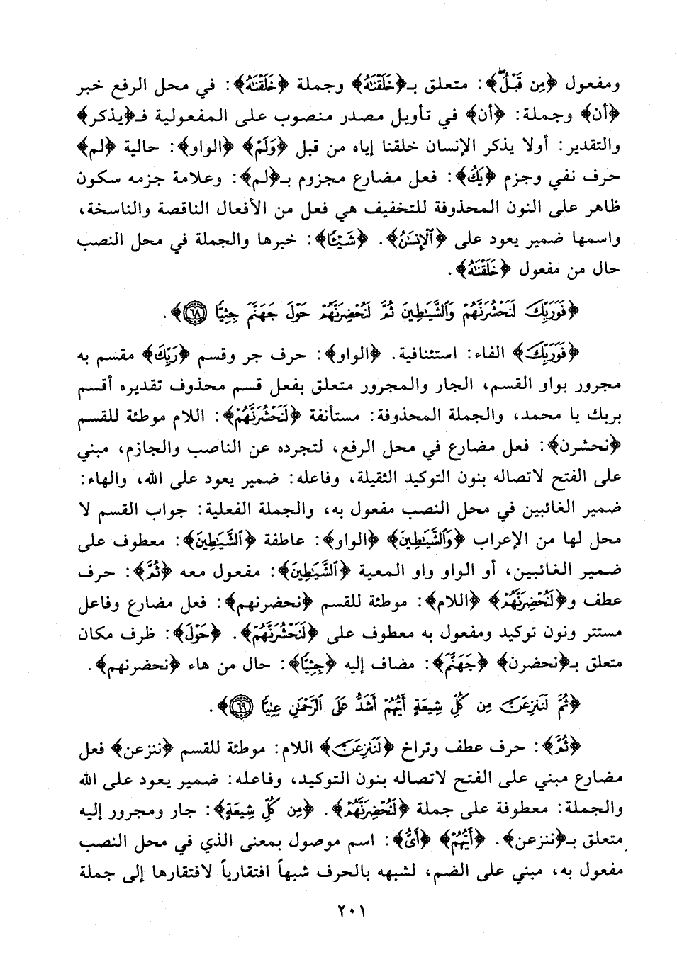 {فَوَرَبِّكَ} الفاء: استئنافية. {الواو}: حرف جر وقسم {رَبِّكَ} مقسم به مجرور بواو القسم، الجار والمجرور متعلق بفعل قسم محذوف تقديره أقسم بربك يا محمد، والجملة المحذوفة: مستأنفة {لَنَحْشُرَنَّهُمْ}: اللام موطئة للقسم {نحشرن}: فعل مضارع في محل الرفع، لتجرده عن الناصب والجازم، مبني على الفتح لاتصاله بنون التوكيد الثقيلة، وفاعله؛ ضمير يعود على الله، والهاء: ضمير الغائبين في محل النصب مفعول به، والجملة الفعلية: جواب القسم لا محل لها من الإعراب {وَالشَّيَاطِينَ} {الواو}: عاطفة {الشَّيَاطِينَ}: معطوف على ضمير الغائبين، أو الواو واو المعية {الشَّيَاطِينَ}: مفعول معه {ثُمَّ}: حرف عطف و {لَنُحْضِرَنَّهُمْ} {اللام}: موطئة للقسم {نحضرنهم}: فعل مضارع وفاعل مستتر ونون توكيد ومفعول به معطوف على {لَنَحْشُرَنَّهُمْ}. {حَوْلَ}: ظرف مكان متعلق بـ {نحضرن} {جَهَنَّمَ}: مضاف إليه {جِثِيًّا}: حال من هاء {نحضرنهم}.