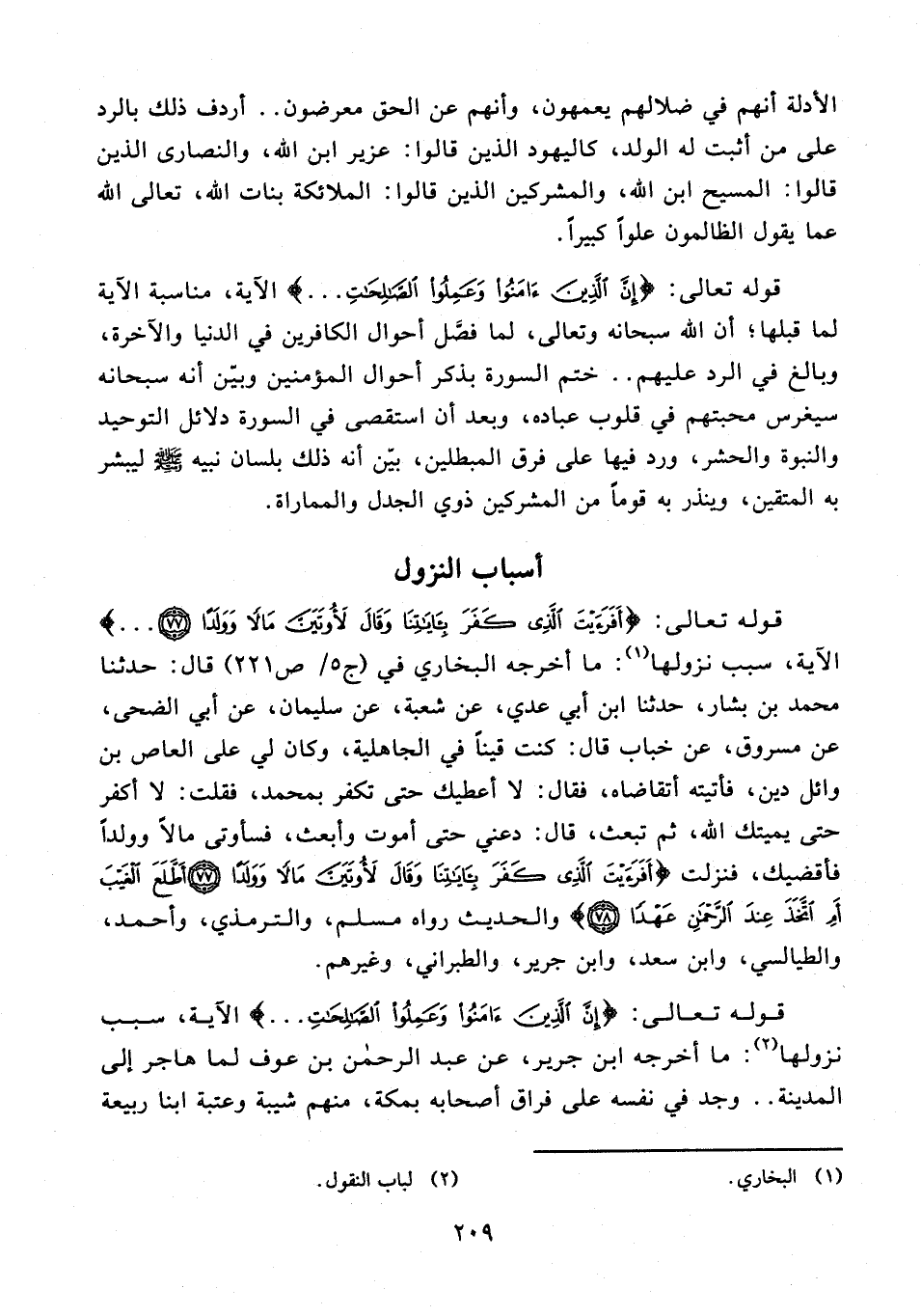 قوله تعالى: {أَفَرَأَيْتَ الَّذِي كَفَرَ بِآيَاتِنَا وَقَالَ لَأُوتَيَنَّ مَالًا وَوَلَدًا (77) ...} الآية، سبب نزولها (¬1): ما أخرجه البخاري في (ج 5/ ص 221) قال: حدثنا محمد بن بشار، حدثنا ابن أبي عدي، عن شعبة، عن سليمان، عن أبي الضحى، عن مسروق، عن خباب قال: كنت قينًا في الجاهلية، وكان لى على العاص بن وائل دين، فأتيته أتقاضاه، فقال: لا أعطيك حتى تكفر بمحمد، فقلت: لا أكفر حتى يميتك الله، ثم تبعث، قال: دعني حتى أموت وأبعث، فسأوتى مالًا وولدًا فأقضيك، فنزلت {أَفَرَأَيْتَ الَّذِي كَفَرَ بِآيَاتِنَا وَقَالَ لَأُوتَيَنَّ مَالًا وَوَلَدًا (77) أَطَّلَعَ الْغَيْبَ أَمِ اتَّخَذَ عِنْدَ الرَّحْمَنِ عَهْدًا (78)} والحديث رواه مسلم، والترمذي، وأحمد، والطيالسي، وابن سعد، وابن جرير، والطبراني، وغيرهم.