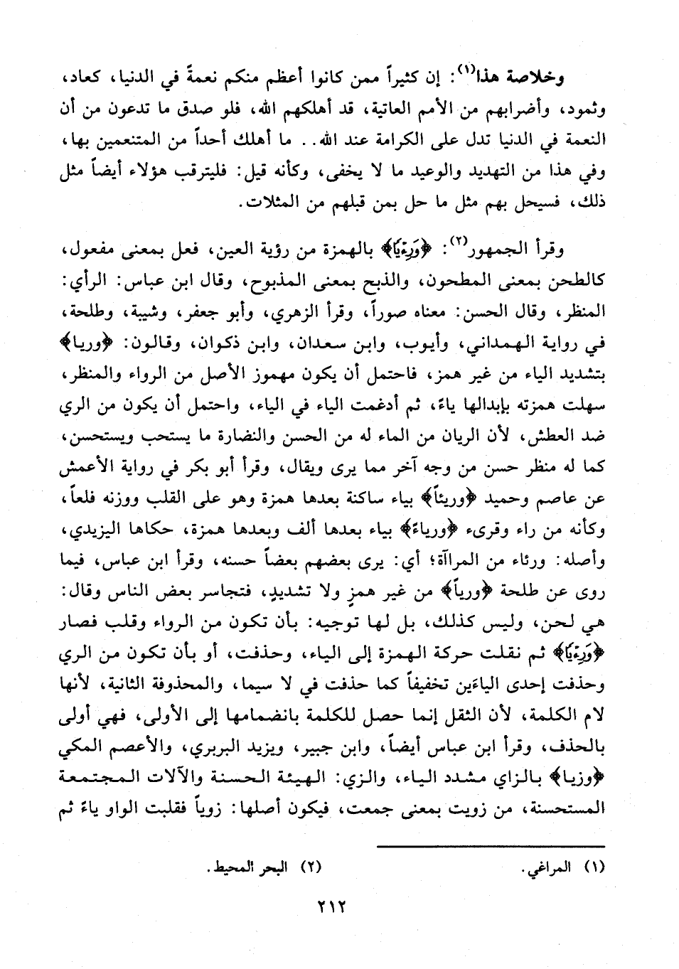 وقرأ الجمهور (¬2): {وَرِئْيًا} بالهمزة من رؤية العين، فعل بمعنى مفعول، كالطحن بمعنى المطحون، والذبح بمعنى المذبوح، وقال ابن عباس: الرأي: المنظر، وقال الحسن: معناه صوراً، وقرأ الزهري، وأبو جعفر، وشيبة، وطلحة، في رواية الهمداني، وأيوب، وابن سعدان، وابن ذكوان، وقالون: {وريا} بتشديد الياء من غير همز، فاحتمل أن يكون مهموز الأصل من الرواء والمنظر، سهلت همزته بإبدالها ياءً، ثم أدغمت الياء في الياء، واحتمل أن يكون من الري ضد العطش؛ لأن الريان من الماء له من الحسن والنضارة ما يستحب ويستحسن، كما له منظر حسن من وجه آخر مما يرى ويقال، وقرأ أبو بكر في رواية الأعمش عن عاصم وحميد {وريئًا} بياء ساكنة بعدها همزة وهو على القلب ووزنه فلعًا، وكأنه من راء وقرىء {ورياءً} بياء بعدها ألف وبعدها همزة، حكاها اليزيدي، وأصله: ورئاء من المراآة؛ أي: يرى بعضهم بعضًا حسنه، وقرأ ابن عباس، فيما روى عن طلحة {وريًا} من غير همزٍ ولا تشديدٍ، فتجاسر بعض الناس وقال: هي لحن، وليس كذلك، بل لها توجيه: بأن تكون من الرواء وقلب فصار {وَرِئْيًا} ثم نقلت حركة الهمزة إلى الياء، وحذفت، أو بأن تكون من الري وحذفت إحدى الياءَين تخفيفًا كما حذفت في لا سيما، والمحذوفة الثانية؛ لأنها لام الكلمة؛ لأن الثقل إنما حصل للكلمة بأنضمامها إلى الأولى، فهي أولى بالحذف، وقرأ ابن عباس أيضًا، وابن جبير، ويزيد البربري، والأعصم المكي {وزيا} بالزاي مشدد الياء، والزي: الهيئة الحسنة والآلات المجتمعة المستحسنة، من زويت بمعنى جمعت، فيكون أصلها: زويًا فقلبت الواو ياءً ثم