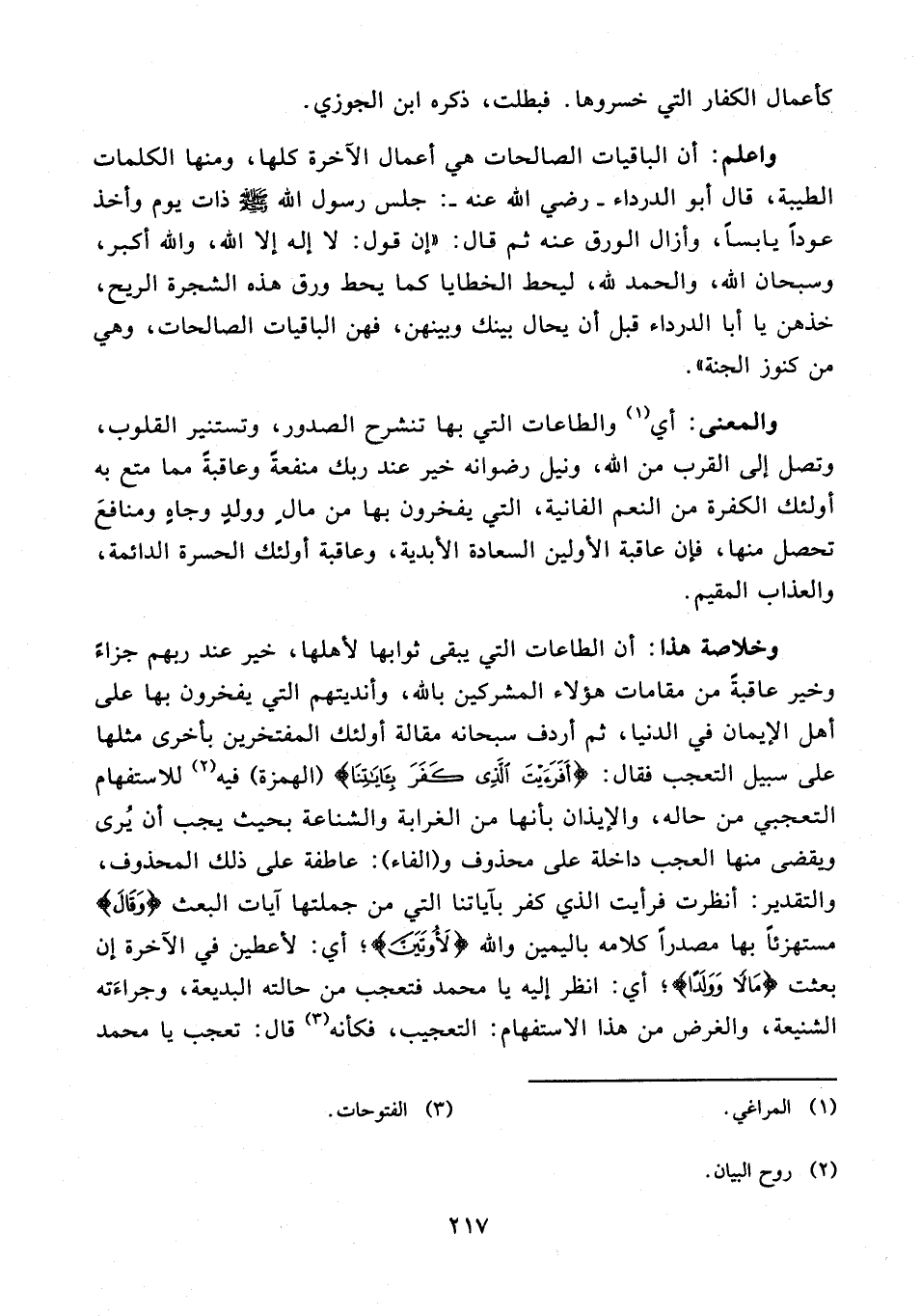 واعلم: أن الباقيات الصالحات هي أعمال الآخرة كلها، ومنها الكلمات الطيبة، قال أبو الدرداء - رضي الله عنه -: جلس رسول الله - صلى الله عليه وسلم - ذات يوم وأخذ عودًا يابسًا، وأزال الورق عنه ثم قال: "إن قول: لا إله إلا الله، والله أكبر، وسبحان الله، والحمد لله، ليحط الخطايا كما يحط ورق هذه الشجرة الريح، خذهن يا أبا الدرداء قبل أن يحال بينك وبينهن، فهن الباقيات الصالحات، وهي من كنوز الجنة".