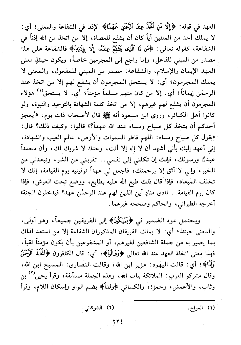 ويحتمل عود الضمير في {يَمْلِكُونَ} إلى الفريقين جميعًا، وهو أولى، والمعنى حينئذ؛ أي: لا يملك الفريقان المذكوران الشفاعة إلا من استعد لذلك بما يصير به من جملة الشافعين لغيرهم، أو المشفوعين بأن يكون مؤمنًا تقيًا، فهذا معنى اتخاذ العهد عند الله تعالى