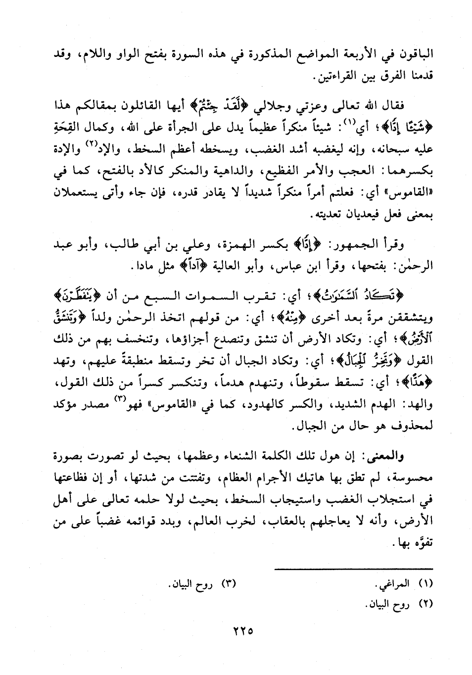 والمعنى: إن هول تلك الكلمة الشنعاء وعظمها، بحيث لو تصورت بصورة محسوسة، لم تطق بها هاتيك الأجرام العظام، وتفتتت من شدتها، أو إن فظاعتها في استجلاب الغضب واستيجاب السخط، بحيث لولا حلمه تعالى على أهل الأرض، وأنه لا يعاجلهم بالعقاب، لخرب العالم، وبدد قوائمه غضبًا على من تفوَّه بها.