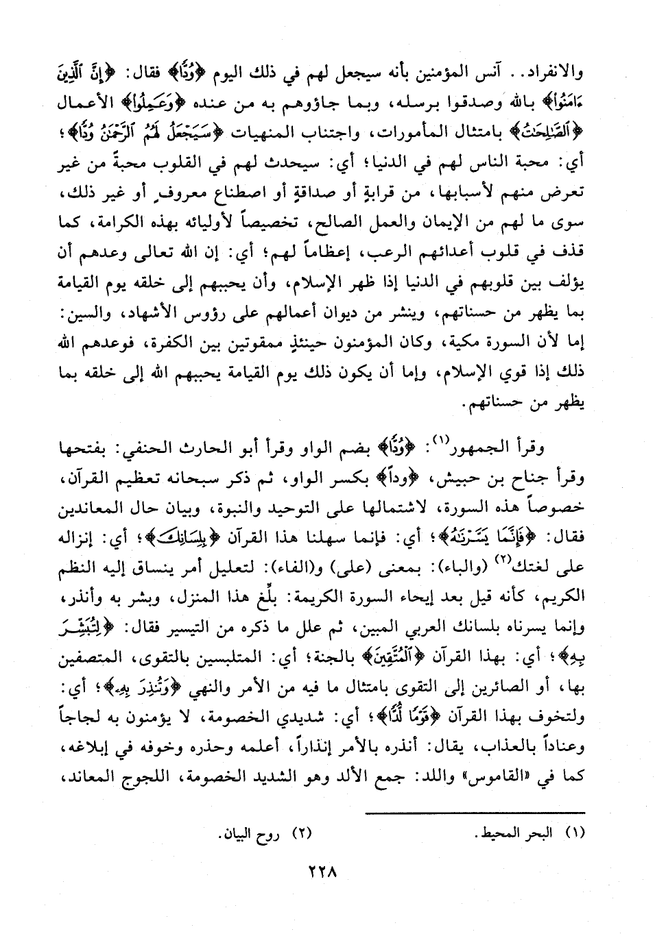 والانفراد .. آنس المؤمنين بأنه سيجعل لهم في ذلك اليوم {وُدًّا} فقال: {إِنَّ الَّذِينَ آمَنُوا} بالله وصدقوا برسله، وبما جاؤوهم به من عنده {وَعَمِلُوا} الأعمال {الصَّالِحَاتِ} بامتثال المأمورات، واجتناب المنهيات {سَيَجْعَلُ لَهُمُ الرَّحْمَنُ وُدًّا} , أي: محبة الناس لهم في الدنيا؛ أي: سيحدث لهم في القلوب محبةً من غير تعرض منهم لأسبابها، من قرابةٍ أو صداقةٍ أو اصطناع معروفٍ أو غير ذلك، سوى ما لهم من الإيمان والعمل الصالح، تخصيصًا لأوليائه بهذه الكرامة، كما قذف في قلوب أعدائهم الرعب، إعظاماً لهم؛ أي: إن الله تعالى وعدهم أن يؤلف بين قلوبهم في الدنيا إذا ظهر الإِسلام، وأن يحببهم إلى خلقه يوم القيامة بما يظهر من حسناتهم، وينشر من ديوان أعمالهم على رؤوس الأشهاد، والسين: إما لأن السورة مكية، وكان المؤمنون حينئذٍ ممقوتين بين الكفرة، فوعدهم الله ذلك إذا قوي الإِسلام، وإما أن يكون ذلك يوم القيامة يحببهم الله إلى خلقه بما يظهر من حسناتهم.