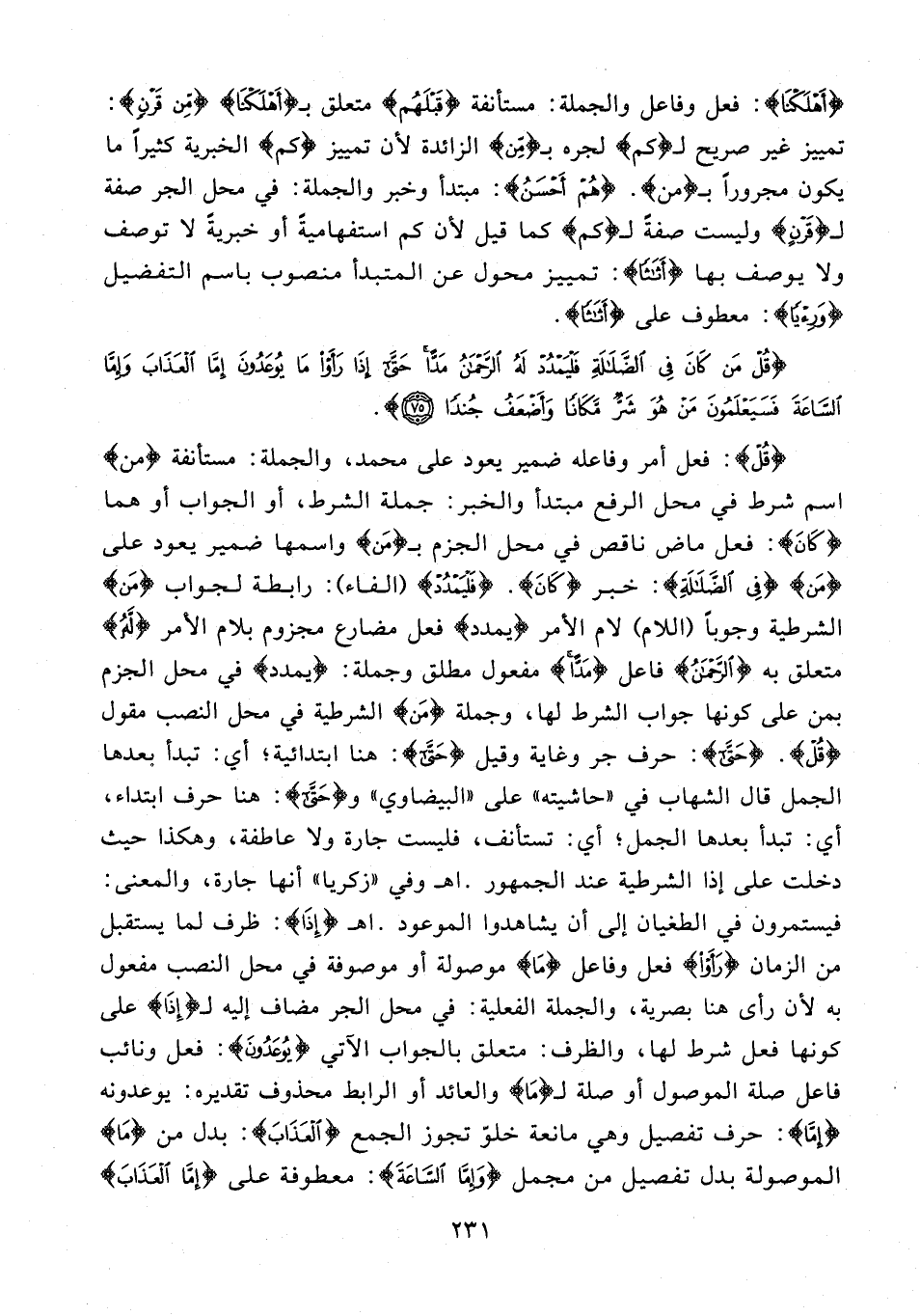 {قُلْ}: فعل أمر وفاعله ضمير يعود على محمد، والجملة: مستأنفة {من} اسم شرط في محل الرفع مبتدأ والخبر: جملة الشرط، أو الجواب أو هما {كَانَ}: فعل ماض ناقص في محل الجزم بـ {مَنْ} واسمها ضمير يعود على {مَنْ} {فِي الضَّلَالَةِ}: خبر {كَانَ}. {فَلْيَمْدُدْ} (الفاء): رابطة لجواب {مَنْ} الشرطية وجوبًا (اللام) لام الأمر {يمدد} فعل مضارع مجزوم بلام الأمر {لَهُ} متعلق به {الرَّحْمَنُ} فاعل {مَدًّا} مفعول مطلق وجملة: {يمدد} في محل الجزم بمن على كونها جواب الشرط لها، وجملة {مَنْ} الشرطية في محل النصب مقول {قُلْ}. {حَتَّى}: حرف جر وغاية وقيل {حَتَّى}: هنا ابتدائية؛ أي: تبدأ بعدها الجمل قال الشهاب في "حاشيته" على "البيضاوي" و {حَتَّى}: هنا حرف ابتداء، أي: تبدأ بعدها الجمل؛ أي: تستأنف، فليست جارة ولا عاطفة، وهكذا حيث دخلت على إذا الشرطية عند الجمهور. اهـ وفي "زكريا" أنها جارة، والمعنى: فيستمرون في الطغيان إلى أن يشاهدوا الموعود. اهـ {إِذَا}: ظرف لما يستقبل من الزمان {رَأَوْا} فعل وفاعل {مَا} موصولة أو موصوفة في محل النصب مفعول به لأن رأى هنا بصرية، والجملة الفعلية: في محل الجر مضاف إليه لـ {إِذَا} على كونها فعل شرط لها، والظرف: متعلق بالجواب الآتي {يُوعَدُونَ}: فعل ونائب فاعل صلة الموصول أو صلة لـ {مَا} والعائد أو الرابط محذوف تقديره: يوعدونه {إِمَّا}: حرف تفصيل وهي مانعة خلوّ تجوز الجمع {الْعَذَابَ}: بدل من {مَا} الموصولة بدل تفصيل من مجمل {وَإِمَّا السَّاعَةَ}: معطوفة على {إِمَّا الْعَذَابَ}