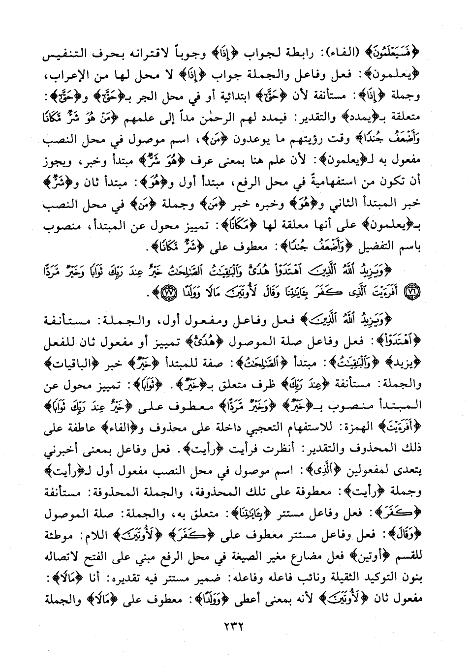 {فَسَيَعْلَمُونَ} (الفاء): رابطة لجواب {إِذَا} وجوبًا لاقترانه بحرف التنفيس {يعلمون}: فعل وفاعل والجملة جواب {إِذَا} لا محل لها من الإعراب، وجملة {إِذَا}: مستأنفة لأن {حَتَّى} ابتدائية أو في محل الجر بـ {حَتَّى} و {حَتَّى}: متعلقة بـ {يمدد} والتقدير: فيمدد لهم الرحمن مدًا إلى علمهم {مَنْ هُوَ شَرٌّ مَكَانًا وَأَضْعَفُ جُنْدًا} وقت رؤيتهم ما يوعدون {مَنْ}، اسم موصول في محل النصب مفعول به لـ {يعلمون}: لأن علم هنا بمعنى عرف {هُوَ شَرٌّ} مبتدأ وخبر، ويجوز أن تكون من استفهاميةً في محل الرفع، مبتدأ أول و {هُوَ}: مبتدأ ثان و {شَرٌّ} خبر المبتدأ الثاني و {هُوَ} وخبره خبر {مَنْ} وجملة {مَنْ} في محل النصب بـ {يعلمون} على أنها معلقة لها {مَكَانًا}: تمييز محول عن المبتدأ، منصوب باسم التفضيل {وَأَضْعَفُ جُنْدًا}: معطوف على {شَرٌّ مَكَانًا}.