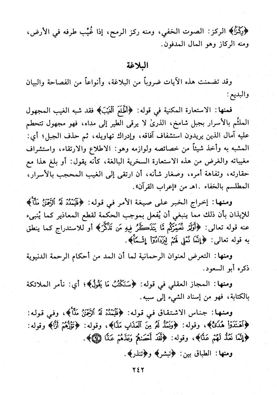 وقد تضمنت هذه الآيات ضروبًا من البلاغة، وأنواعًا من الفصاحة والبيان والبديع: