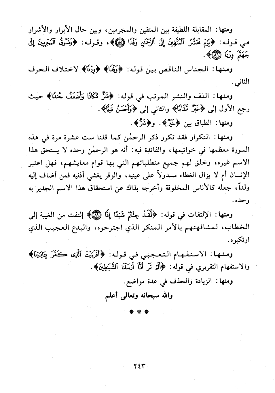 ومنها: المقابلة اللطيفة بين المتقين والمجرمين، وبين حال الأبرار والأشرار في قوله: {يَوْمَ نَحْشُرُ الْمُتَّقِينَ إِلَى الرَّحْمَنِ وَفْدًا (85)}، وقوله: {وَنَسُوقُ الْمُجْرِمِينَ إِلَى جَهَنَّمَ وِرْدًا (86)}.