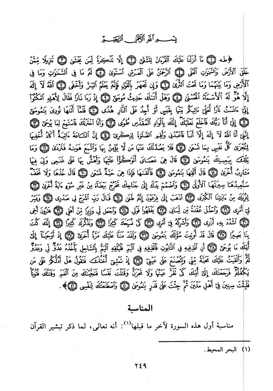 {طه (1) مَا أَنْزَلْنَا عَلَيْكَ الْقُرْآنَ لِتَشْقَى (2) إِلَّا تَذْكِرَةً لِمَنْ يَخْشَى (3) تَنْزِيلًا مِمَّنْ خَلَقَ الْأَرْضَ وَالسَّمَاوَاتِ الْعُلَى (4) الرَّحْمَنُ عَلَى الْعَرْشِ اسْتَوَى (5) لَهُ مَا فِي السَّمَاوَاتِ وَمَا فِي الْأَرْضِ وَمَا بَيْنَهُمَا وَمَا تَحْتَ الثَّرَى (6) وَإِنْ تَجْهَرْ بِالْقَوْلِ فَإِنَّهُ يَعْلَمُ السِّرَّ وَأَخْفَى (7) اللَّهُ لَا إِلَهَ إِلَّا هُوَ لَهُ الْأَسْمَاءُ الْحُسْنَى (8) وَهَلْ أَتَاكَ حَدِيثُ مُوسَى (9) إِذْ رَأَى نَارًا فَقَالَ لِأَهْلِهِ امْكُثُوا إِنِّي آنَسْتُ نَارًا لَعَلِّي آتِيكُمْ مِنْهَا بِقَبَسٍ أَوْ أَجِدُ عَلَى النَّارِ هُدًى (10) فَلَمَّا أَتَاهَا نُودِيَ يَا مُوسَى (11) إِنِّي أَنَا رَبُّكَ فَاخْلَعْ نَعْلَيْكَ إِنَّكَ بِالْوَادِ الْمُقَدَّسِ طُوًى (12) وَأَنَا اخْتَرْتُكَ فَاسْتَمِعْ لِمَا يُوحَى (13) إِنَّنِي أَنَا اللَّهُ لَا إِلَهَ إِلَّا أَنَا فَاعْبُدْنِي وَأَقِمِ الصَّلَاةَ لِذِكْرِي (14) إِنَّ السَّاعَةَ آتِيَةٌ أَكَادُ أُخْفِيهَا لِتُجْزَى كُلُّ نَفْسٍ بِمَا تَسْعَى (15) فَلَا يَصُدَّنَّكَ عَنْهَا مَنْ لَا يُؤْمِنُ بِهَا وَاتَّبَعَ هَوَاهُ فَتَرْدَى (16) وَمَا تِلْكَ بِيَمِينِكَ يَا مُوسَى (17) قَالَ هِيَ عَصَايَ أَتَوَكَّأُ عَلَيْهَا وَأَهُشُّ بِهَا عَلَى غَنَمِي وَلِيَ فِيهَا مَآرِبُ أُخْرَى (18) قَالَ أَلْقِهَا يَا مُوسَى (19) فَأَلْقَاهَا فَإِذَا هِيَ حَيَّةٌ تَسْعَى (20) قَالَ خُذْهَا وَلَا تَخَفْ سَنُعِيدُهَا سِيرَتَهَا الْأُولَى (21) وَاضْمُمْ يَدَكَ إِلَى جَنَاحِكَ تَخْرُجْ بَيْضَاءَ مِنْ غَيْرِ سُوءٍ آيَةً أُخْرَى (22) لِنُرِيَكَ مِنْ آيَاتِنَا الْكُبْرَى (23) اذْهَبْ إِلَى فِرْعَوْنَ إِنَّهُ طَغَى (24) قَالَ رَبِّ اشْرَحْ لِي صَدْرِي (25) وَيَسِّرْ لِي أَمْرِي (26) وَاحْلُلْ عُقْدَةً مِنْ لِسَانِي (27) يَفْقَهُوا قَوْلِي (28) وَاجْعَلْ لِي وَزِيرًا مِنْ أَهْلِي (29) هَارُونَ أَخِي (30) اشْدُدْ بِهِ أَزْرِي (31) وَأَشْرِكْهُ فِي أَمْرِي (32) كَيْ نُسَبِّحَكَ كَثِيرًا (33) وَنَذْكُرَكَ كَثِيرًا (34) إِنَّكَ كُنْتَ بِنَا بَصِيرًا (35) قَالَ قَدْ أُوتِيتَ سُؤْلَكَ يَا مُوسَى (36) وَلَقَدْ مَنَنَّا عَلَيْكَ مَرَّةً أُخْرَى (37) إِذْ أَوْحَيْنَا إِلَى أُمِّكَ مَا يُوحَى (38) أَنِ اقْذِفِيهِ فِي التَّابُوتِ فَاقْذِفِيهِ فِي الْيَمِّ فَلْيُلْقِهِ الْيَمُّ بِالسَّاحِلِ يَأْخُذْهُ عَدُوٌّ لِي وَعَدُوٌّ لَهُ وَأَلْقَيْتُ عَلَيْكَ مَحَبَّةً مِنِّي وَلِتُصْنَعَ عَلَى عَيْنِي (39) إِذْ تَمْشِي أُخْتُكَ فَتَقُولُ هَلْ أَدُلُّكُمْ عَلَى مَنْ يَكْفُلُهُ فَرَجَعْنَاكَ إِلَى أُمِّكَ كَيْ تَقَرَّ عَيْنُهَا وَلَا تَحْزَنَ وَقَتَلْتَ نَفْسًا فَنَجَّيْنَاكَ مِنَ الْغَمِّ وَفَتَنَّاكَ فُتُونًا فَلَبِثْتَ سِنِينَ فِي أَهْلِ مَدْيَنَ ثُمَّ جِئْتَ عَلَى قَدَرٍ يَا مُوسَى (40) وَاصْطَنَعْتُكَ لِنَفْسِي (41)}.
