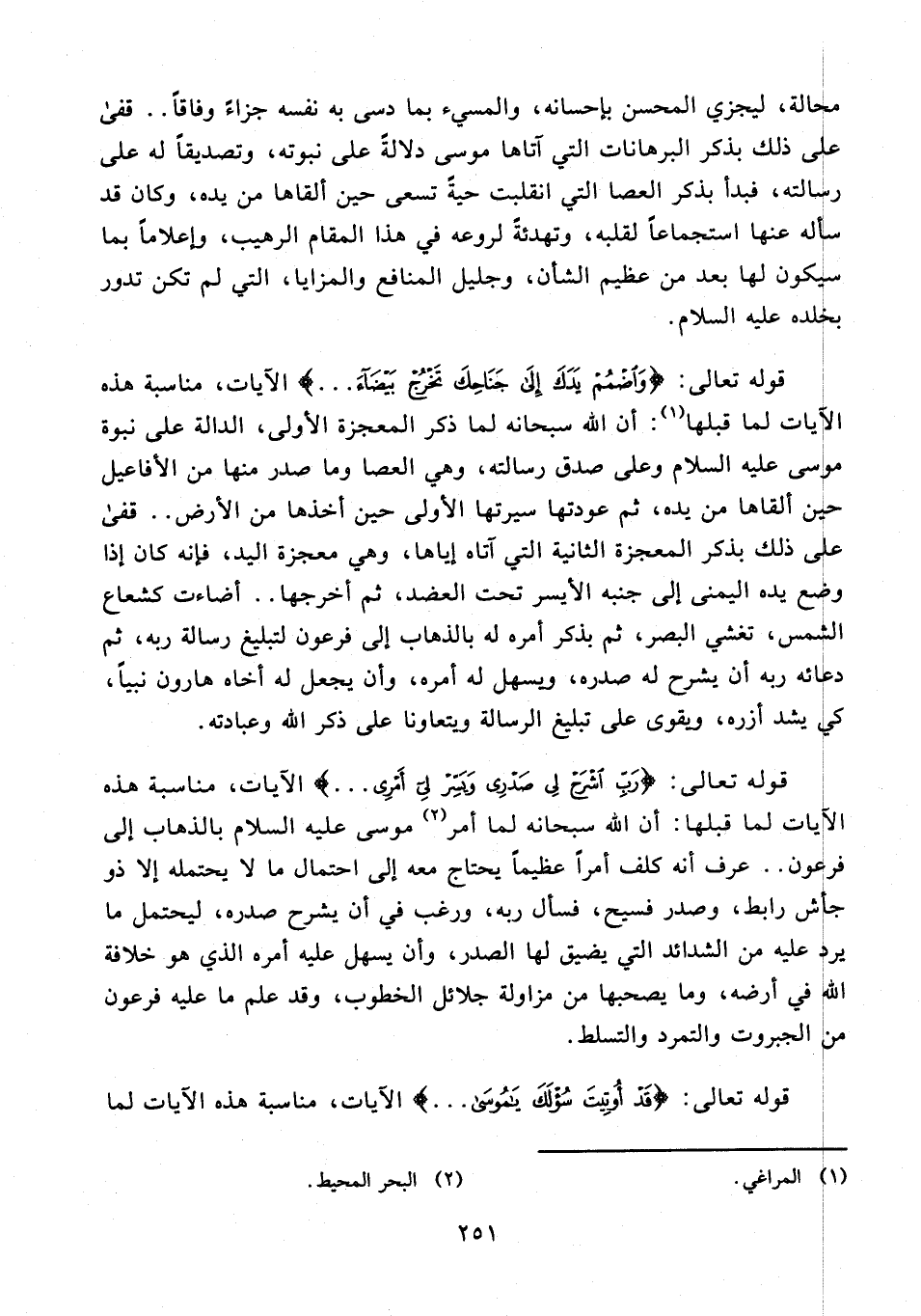 قوله تعالى: {وَاضْمُمْ يَدَكَ إِلَى جَنَاحِكَ تَخْرُجْ بَيْضَاءَ ...} الآيات، مناسبة هذه الآيات لما قبلها (¬1): أن الله سبحانه لما ذكر المعجزة الأولى، الدالة على نبوة موسى عليه السلام وعلى صدق رسالته، وهي العصا وما صدر منها من الأفاعيل حين ألقاها من يده، ثم عودتها سيرتها الأولى حين أخذها من الأرض .. قفى على ذلك بذكر المعجزة الثانية التي آتاه إياها، وهي معجزة اليد، فإنه كان إذا وضع يده اليمنى إلى جنبه الأيسر تحت العضد، ثم أخرجها .. أضاءت كشعاع الشمس، تغشي البصر، ثم بذكر أمره له بالذهاب إلى فرعون لتبليغ رسالة ربه، ثم دعائه ربه أن يشرح له صدره، ويسهل له أمره، وأن يجعل له أخاه هارون نبيًا، كى يشد أزره، ويقوى على تبليغ الرسالة ويتعاونا على ذكر الله وعبادته.