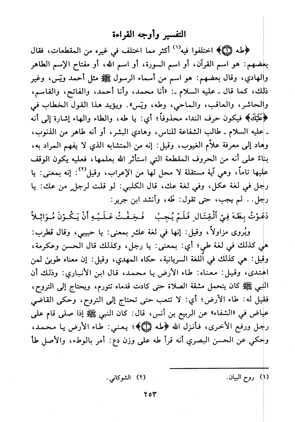 ويُروى مزاولًا، وقيل: إنها في لغة عكٍ بمعنى: يا حبيبي، وقال قطرب: هي كذلك في لغة طي؛ أي: بمعنى: يا رجل، وكذلك قال الحسن وعكرمة، وقيل: هي كذلك في اللغة السريانية، حكاه المهدي، وقيل: إن معناه طوبى لمن اهتدى، وقيل: معناه: طاء الأرض يا محمد، قال ابن الأنباري: وذلك أن النبي - صلى الله عليه وسلم - كان يتحمل مشقة الصلاة حتى كادت قدماه تتورم، ويحتاج إلى التروح، فقيل له: طاء الأرض؛ أي: لا تتعب حتى تحتاج إلى التروح، وحكى القاضي عياض في "الشفاء" عن الربيع بن أنس، قال: كان النبي - صلى الله عليه وسلم - إذا صلى قام على رجل ورفع الأخرى، فأنزل الله {طه (1)} يعني: طاء الأرض يا محمد، وحكي عن الحسن البصري أنه قرأ طه على وزن دع: أمر بالوطء، والأصل طأ
