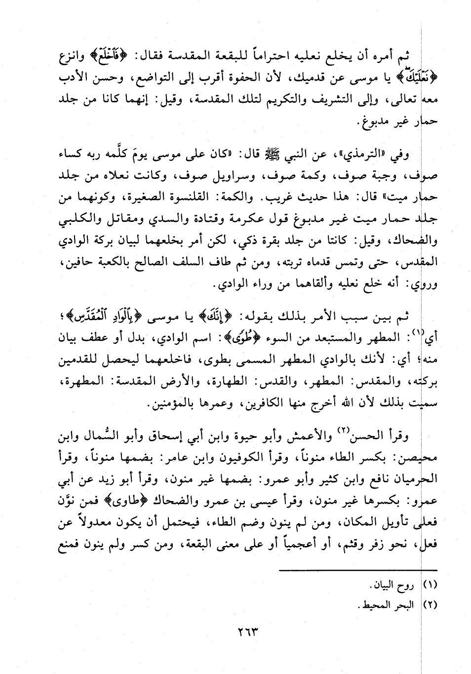 وفي "الترمذي"، عن النبي - صلى الله عليه وسلم - قال: "كان على موسى يومَ كلَّمه ربه كساء صوف، وجبة صوف، وكمة صوف، وسراويل صوف، وكانت نعلاه من جلد حمار ميت" قال: هذا حديث غريب. والكمة: القلنسوة الصغيرة، وكونهما من جلد حمار ميت غير مدبوغ قول عكرمة وقتادة والسدي ومقاتل والكلبي والضحاك، وقيل: كانتا من جلد بقرة ذكي، لكن أمر بخلعهما لبيان بركة الوادي المقدس، حتى وتمس قدماه تربته، ومن ثم طاف السلف الصالح بالكعبة حافين، وروي: أنه خلع نعليه وألقاهما من وراء الوادي.