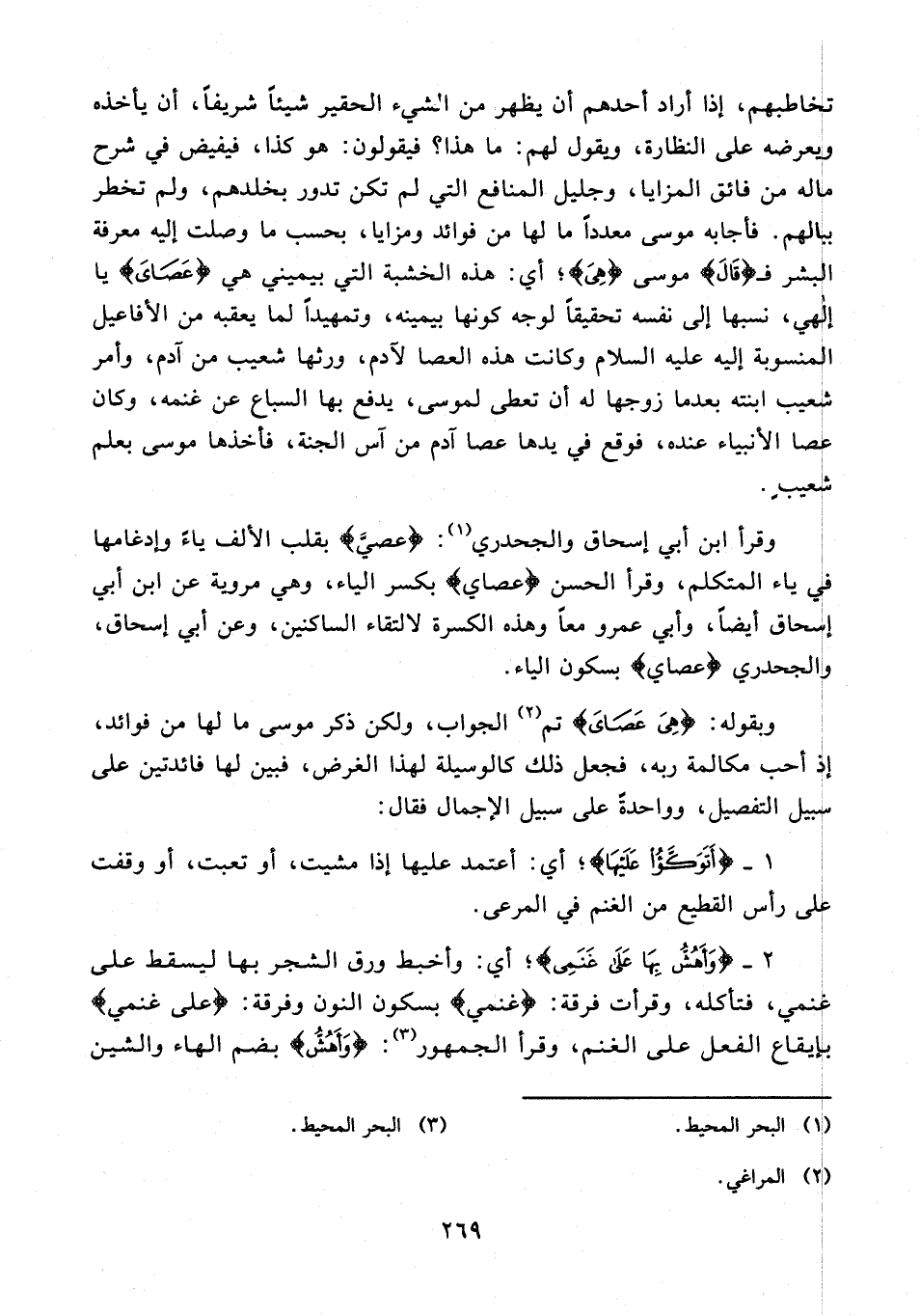 2 - {وَأَهُشُّ بِهَا عَلَى غَنَمِي}؛ أي: وأخبط ورق الشجر بها ليسقط على غنمي، فتأكله، وقرأت فرقة: {غنمي} بسكون النون وفرقة: {على غنمي} بإيقاع الفعل على الغنم، وقرأ الجمهور (¬3): {وَأَهُشُّ} بضم الهاء والشين