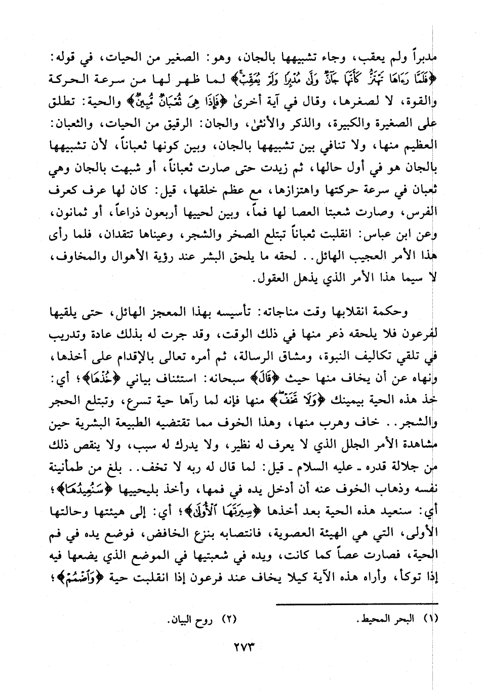 مدبرًا ولم يعقب، وجاء تشبيهها بالجان، وهو: الصغير من الحيات، في قوله: {فَلَمَّا رَآهَا تَهْتَزُّ كَأَنَّهَا جَانٌّ وَلَّى مُدْبِرًا وَلَمْ يُعَقِّبْ} لما ظهر لها من سرعة الحركة والقوة، لا لصغرها، وقال في آية أخرى {فَإِذَا هِيَ ثُعْبَانٌ مُبِينٌ} والحية: تطلق على الصغيرة والكبيرة، والذكر والأنثى، والجان: الرقيق من الحيات، والثعبان: العظيم منها, ولا تنافي بين تشبيهها بالجان، وبين كونها ثعبانًا؛ لأن تشبيهها بالجان هو في أول حالها، ثم زيدت حتى صارت ثعبانًا، أو شبهت بالجان وهي ثعبان في سرعة حركتها واهتزازها، مع عظم خلقها، قيل: كان لها عرف كعرف الفرس، وصارت شعبتا العصا لها فمًا، وبين لحييها أربعون ذراعًا، أو ثمانون، وعن ابن عباس: انقلبت ثعبانًا تبتلع الصخر والشجر، وعيناها تتقدان، فلما رأى هذا الأمر العجيب الهائل .. لحقه ما يلحق البشر عند رؤية الأهوال والمخاوف، لا سيما هذا الأمر الذي يذهل العقول.