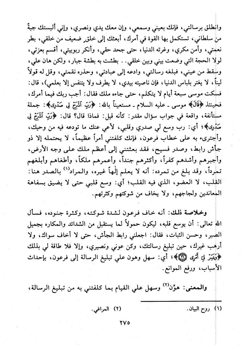 وخلاصة ذلك: أنه خاف فرعون لشدة شوكته، وكثرة جنوده، فسأل الله تعالى: أن يوسع قلبه، ليكون حمولاً لما يستقبل من الشدائد والمكاره بجميل الصبر، وحسن الثبات، فقال: اجعلني رابط الجأش، حتى لا أخاف سواك، ولا أرهب غيرك، حين تبليغ رسالتك، وكن عوني ونصيري، وإلا فلا طاقة لي بذلك