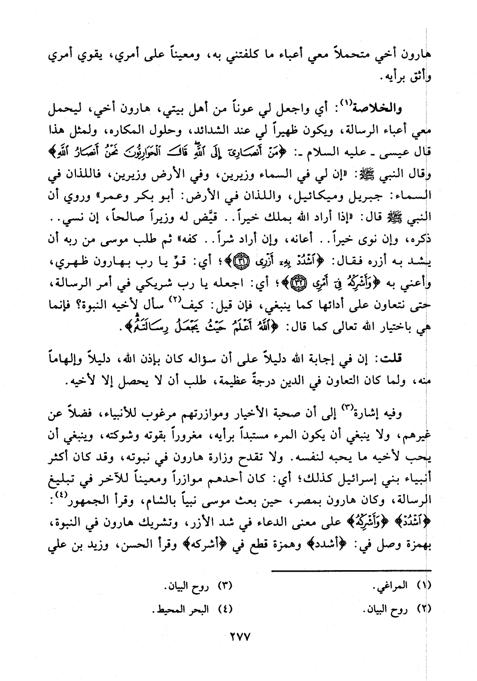 والخلاصة (¬1): أي واجعل لي عوناً من أهل بيتي، هارون أخي، ليحمل معي أعباء الرسالة، ويكون ظهيرًا لى عند الشدائد، وحلول المكاره، ولمثل هذا قال عيسى - عليه السلام -: {مَنْ أَنْصَارِي إِلَى اللَّهِ قَالَ الْحَوَارِيُّونَ نَحْنُ أَنْصَارُ اللَّهِ} قال النبي - صلى الله عليه وسلم -: "إن لي في السماء وزيرين، وفي الأرض وزيرين، فاللذان في السماء: جبريل وميكائيل، واللذان في الأرض: أبو بكر وعمر" وروي أن النبي - صلى الله عليه وسلم - قال: "إذا أراد الله بملك خيرًا .. قيَّض له وزيرًا صالحًا، إن نسي .. ذكره، وان نوى خيرًا .. أعانه، وإن أراد شرًا .. كفه"