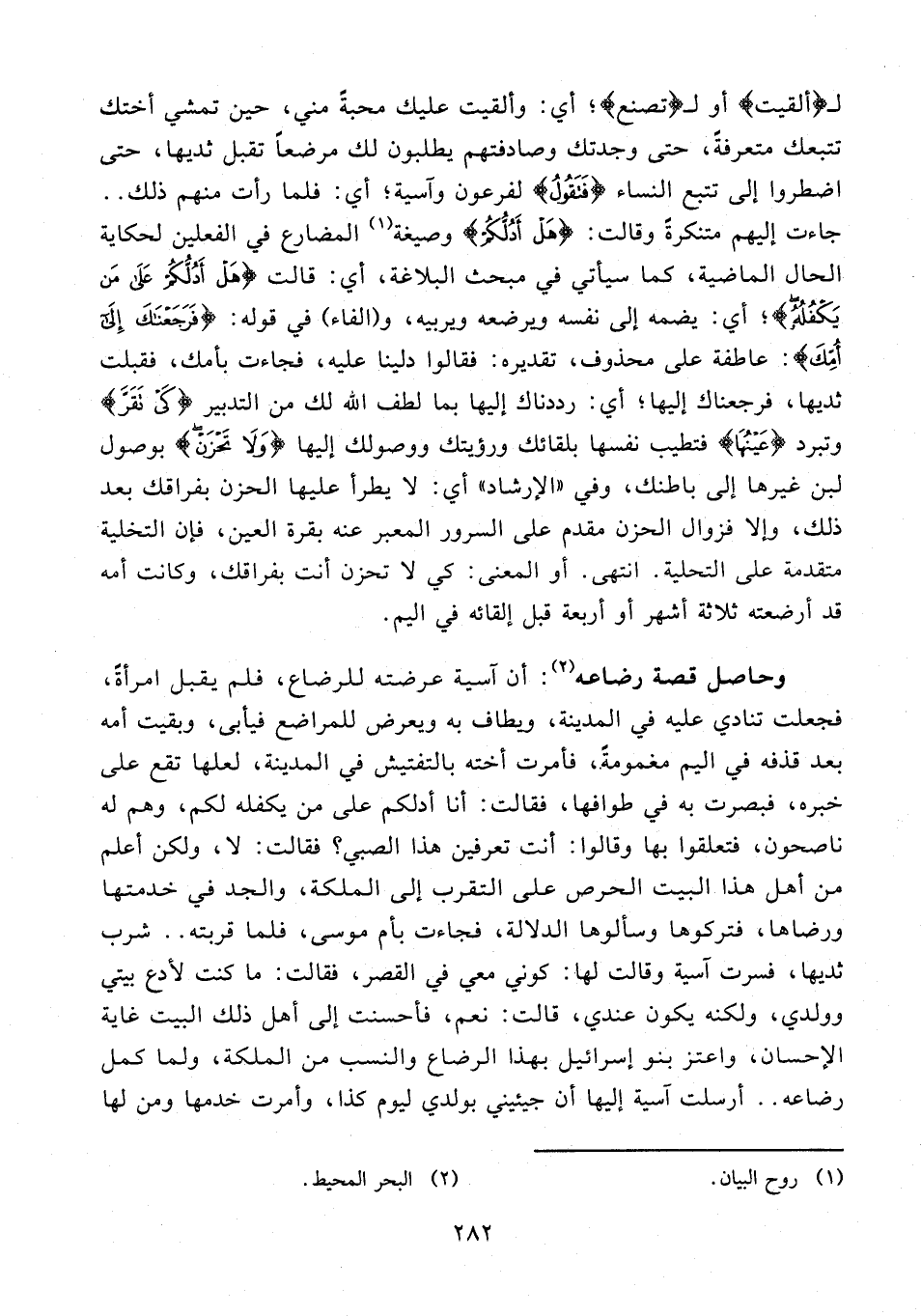 وحاصل قصة رضاعه (¬2): أن آسية عرضته للرضاع، فلم يقبل امرأةً، فجعلت تنادي عليه في المدينة، ويطاف به ويعرض للمراضع فيأبى، وبقيت أمه بعد قذفه في اليم مغمومةً، فأمرت أخته بالتفتيش في المدينة، لعلها تقع على خبره، فبصرت به في طوافها، فقالت: أنا أدلكم على من يكفله لكم، وهم له ناصحون، فتعلقوا بها وقالوا: أنت تعرفين هذا الصبي؟ فقالت: لا, ولكن أعلم من أهل هذا البيت الحرص على التقرب إلى الملكة، والجد في خدمتها ورضاها، فتركوها وسألوها الدلالة، فجاءت بأم موسى، فلما قربته .. شرب ثديها، فسرت آسية وقالت لها: كوني معي في القصر، فقالت: ما كنت لأدع بيتي وولدي، ولكنه يكون عندي، قالت: نعم، فأحسنت إلى أهل ذلك البيت غاية "الإحسان" واعتز بنو إسرائيل بهذا الرضاع والنسب من الملكة، ولما كمل رضاعه .. أرسلت آسية إليها أن جيئيني بولدي ليوم كذا، وأمرت خدمها ومن لها