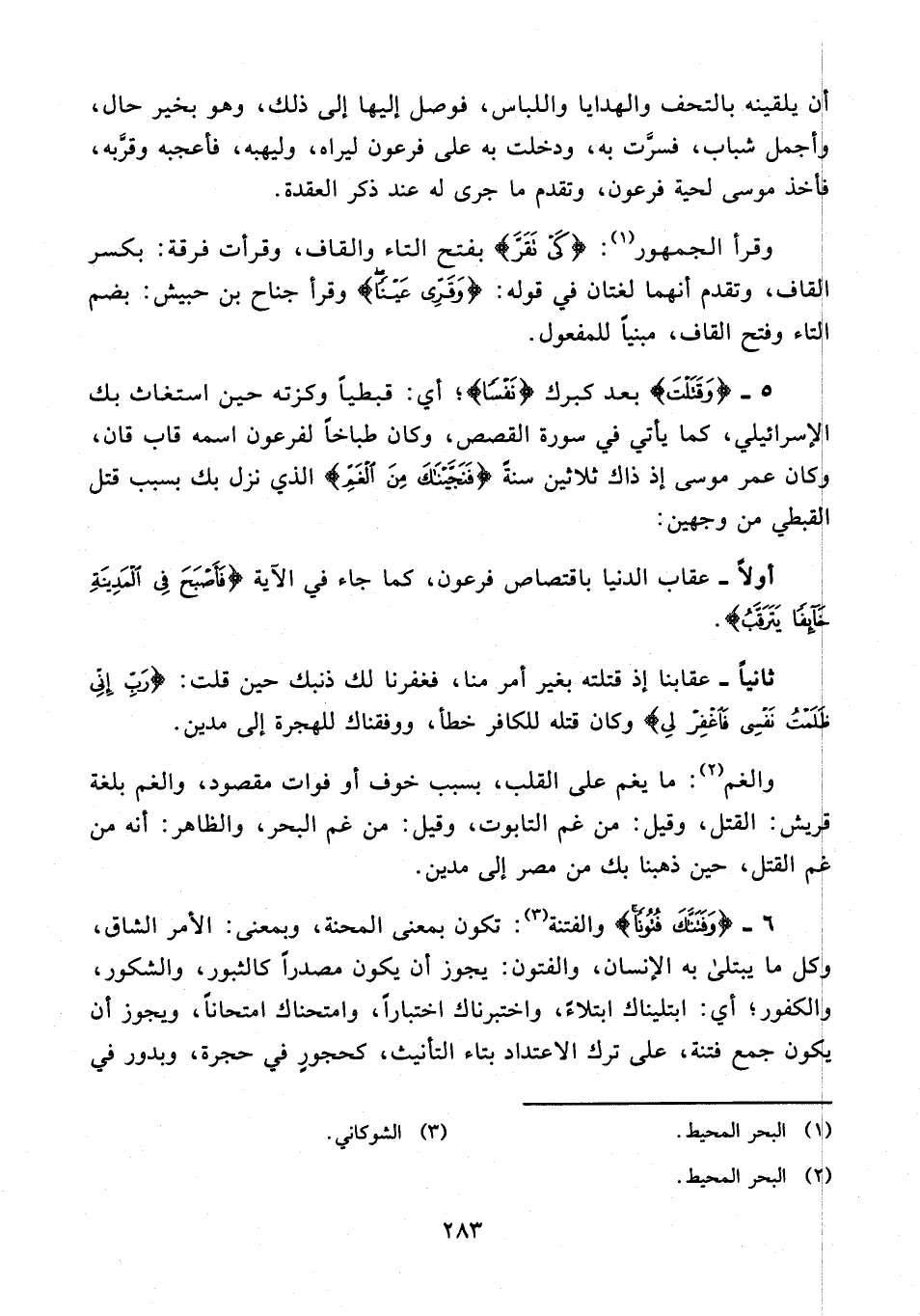 5 - {وَقَتَلْتَ} بعد كبرك {نَفْسًا}؛ أي: قبطيًا وكزته حين استغاث بك الإسرائيلي، كما يأتي في سورة القصص، وكان طباخًا لفرعون اسمه قاب قان، وكان عمر موسى إذ ذاك ثلاثين سنةً {فَنَجَّيْنَاكَ مِنَ الْغَمِّ} الذي نزل بك بسبب قتل القبطي من وجهين: